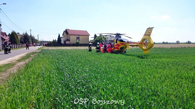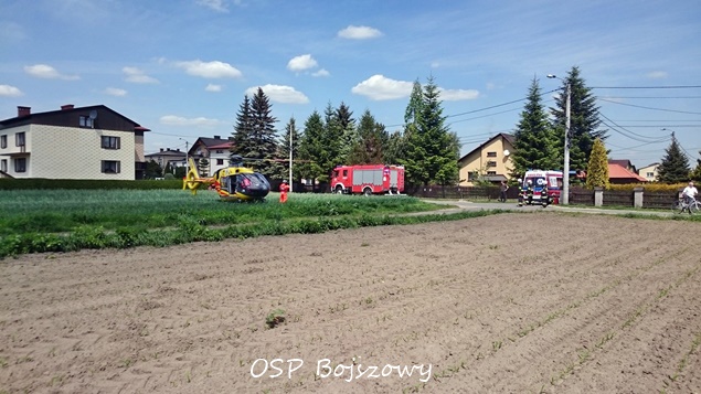 16 maja około godziny 12:35 zastępy OSP Bojszowy (GBA) i JRG Tychy (GCBA, SCRt) zostały zadysponowane do zabezpieczenia lądowiska dla śmigłowca LPR Ratownik 4 z bazy w Gliwicach. Śmigłowiec został wezwany do Bojszów na ul. Żytnią, gdzie doszło do wypadku. Mężczyzna spadł z wysokości doznając urazu czaszkowo – mózgowego. Ratownicy medyczni będący na miejscu podjęli decyzje o konieczności transportu poszkodowanego do szpitala w Sosnowcu. Poszkodowany mężczyzna w trakcie transportu znajdował się w stanie ciężkim.