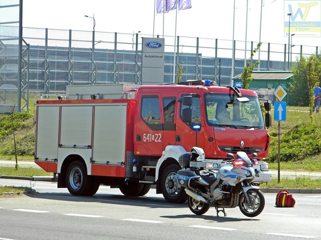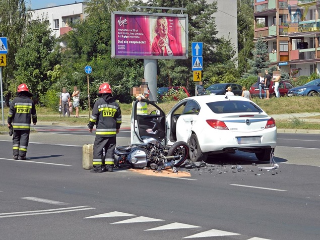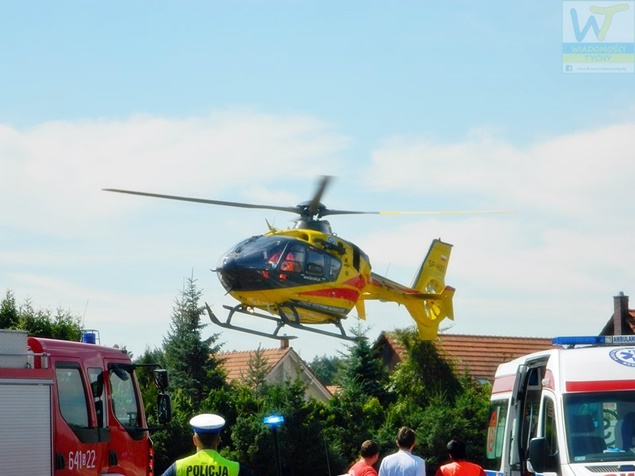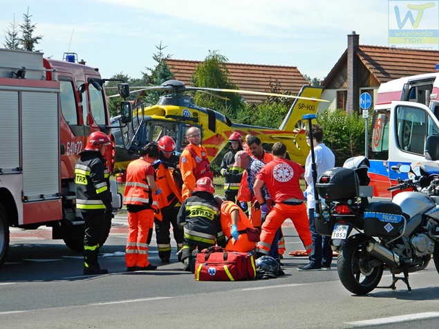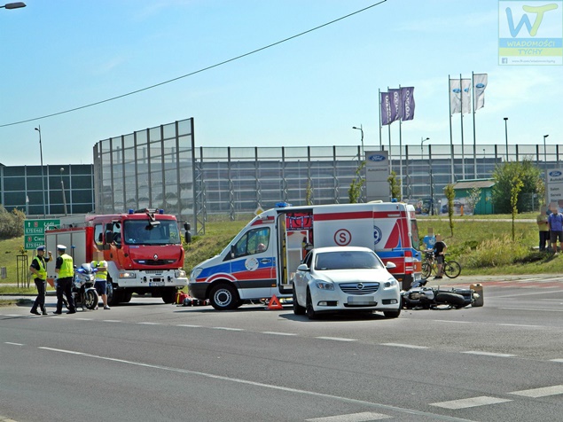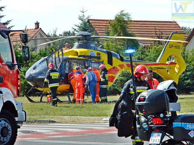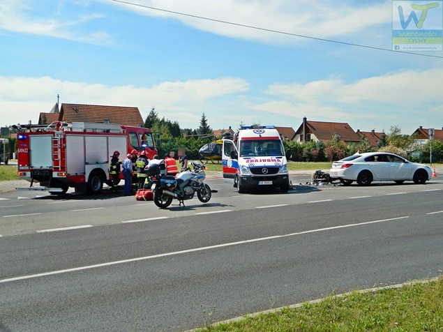 19 sierpnia około godziny 11.30 na skrzyżowaniu ulic Sikorskiego – Zacisze – Żółkiewskiego doszło do zdarzenia drogowego z udziałem jednośladu. W zdarzeniu brał udział motocykl i samochód osobowy Opel. Na miejsce zadysponowany został ZRM, patrole tyskiej Policji, jeden zastęp z JRG Tychy (GBA) i patrol Straży Miejskiej. Po dotarciu na miejsce i zabezpieczeniu miejsca zdarzenia okazało się, że obrażenia kierowcy jednośladu są na tyle poważne, że musi on zostać przetransportowany do szpitala w Sosnowcu. W tym celu na miejsce wezwany został śmigłowiec LPR. Strażacy zabezpieczyli dla niego lądowisko. Dodatkowo zabezpieczyli oni uszkodzone pojazdy, zneutralizowali rozlane płyny eksploatacyjne. Na czas trwania działań ratowniczych ruch na ul. Sikorskiego był całkowicie wstrzymany. Dokładne przyczyny i okoliczności tego zdarzenia wyjaśni policyjne dochodzenie.