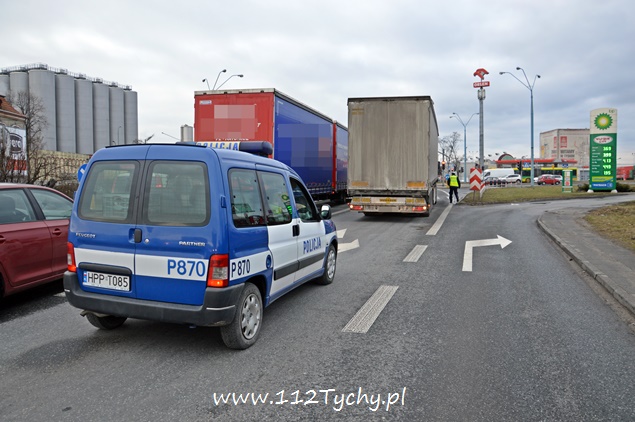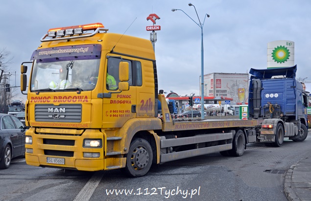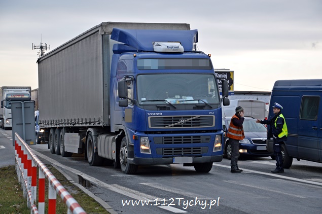 14 stycznia po godzinie 13 do dyżurnego tyskiej Policji wpłynęło zgłoszenie o utrudnieniach w ruchu na ulicy Oświęcimskiej w rejonie skrzyżowania z ulicą Katowicką i Mikołowską. Na miejsce wysłany został patrol drogówki celem sprawdzenia zgłoszenia. Po dotarciu na miejsce zgłoszenie się potwierdziło. Na prawym pasie w kierunku Mikołowa na wysokości zjazdu na stacje paliw BP doszło do awarii układu hamulcowego w samochodzie ciężarowym Volvo z naczepą. Kierujący zestawem poinformował policjantów, że na miejsce wezwany już został holownik, a zestawem nie da się ruszyć. Przez blisko godzinę policjanci i kierowca czekali na pomoc drogową. Po dotarciu na miejsce holownika okazało się, że zestawem bez żadnego kłopotu dało się cofnąć na pas do skrętu na stację. Uszkodzony ciągnik siodłowy został odholowany, a naczepa podpięta pod zastępczy ciągnik siodłowy podesłany przez spedytora. Policjanci w odpowiedni sposób nagrodzili upartego kierowcę, który przez blisko dwie godziny utrudniał ruch. Korek spowodowany przez uszkodzony pojazd sięgał w krytycznym momencie do URBANOWIC (około 6km).