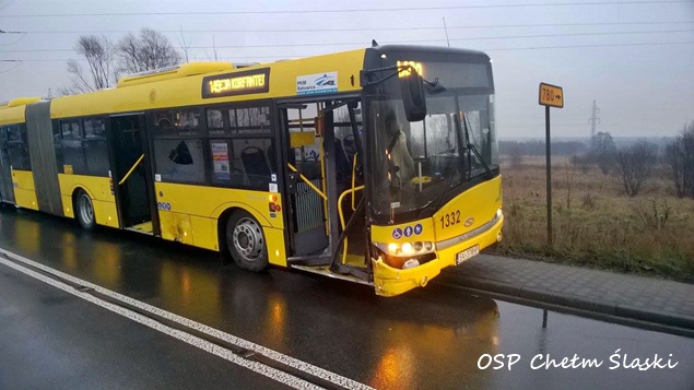 26 stycznia po godzinie 7:00 do MSK w Tychach wpłynęło zgłoszenie o zdarzeniu drogowym w Chełmie Śląskim na skrzyżowaniu ulic Dożynkowej i Górnośląskiej. Na miejsce wysłany został zastęp z OSP Chełm Śląski (GLBM) i dwa zastępy z JRG Tychy (GBA, SLRt). Ze zgłoszenia wynikało, że nie ma osób poszkodowanych. Do zdarzenia doszło na skutek wymuszenia pierwszeństwa przejazdu przez autobus komunikacji miejskiej. Doszło do zderzenia autobusu Solaris z samochodem osobowym Seat. Na miejsce wezwany został patrol WRD KPP Bieruń. Działania straży polegały na zabezpieczeniu miejsca zdarzenia, a później usunięciu pojazdów. Po godzinie działań zastępy wróciły do koszar.