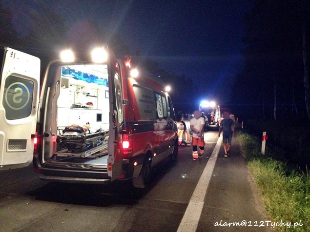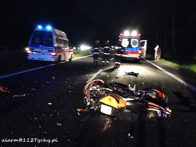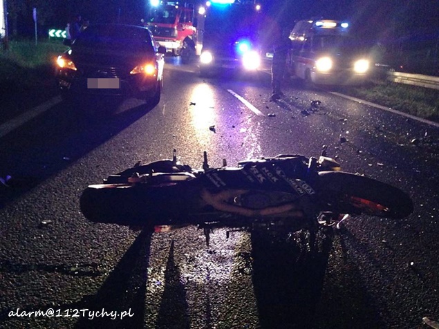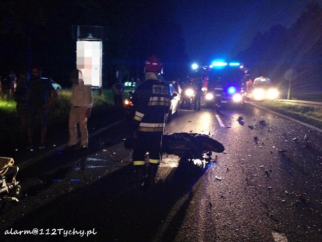 28 sierpnia około godziny 20.10 do MSK w Tychach wpłynęło zgłoszenie o zdarzeniu drogowym na trasie DK 1 w rejonie zajazdu Pod Dzikiem na pasie w kierunku Katowic. Ze zgłoszenia wynikało, że w zdarzeniu miał brać udział motocykl i samochód osobowy. Ze względu na pogranicze rejonu do działań wysłane zostały zastępy strażaków z JRG Tychy (GBA, SCRt) i JRG Pszczyna (GBA, SLRt), patrole pszczyńskiej Policji i kilka ZRM. Po dotarciu na miejsce zgłoszenie potwierdziło się. W zdarzeniu poszkodowane zostały dwie osoby (kobieta i mężczyzna) podróżujące motocyklem Honda, który uderzył w tył osobowego Subaru. Podróżującym samochodem osobowym nic się nie stało. Ruch w kierunku Katowic został zablokowany, a pszczyńska Policja zorganizowała objazd starą drogą od skrzyżowania ze światłami ( samochody były zawracane z miejsca zdarzenia). Działania strażaków na miejscu zdarzenia polegały na jego zabezpieczeniu, oświetleniu i posprzątaniu elementów rozbitych pojazdów. Dopiero około godziny 22 ruch został powoli przywrócony. Pszczyńska Policja prowadzi dalsze czynności w tej sprawie mające na celu ustalenie przyczyn i okoliczności tego wypadku.