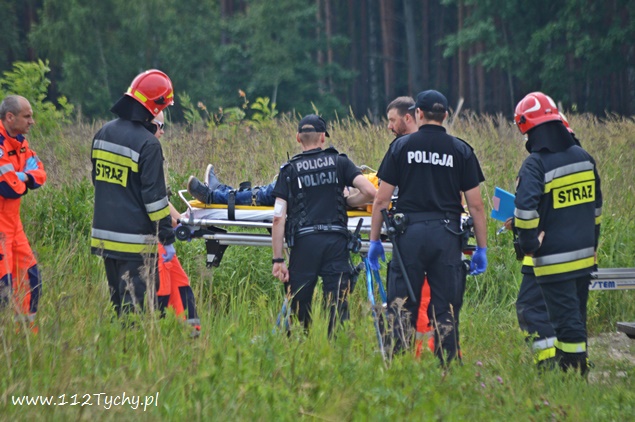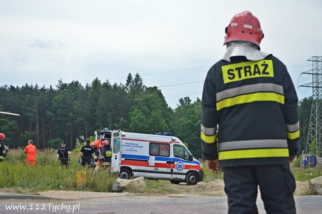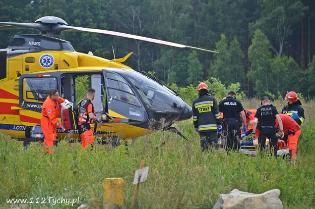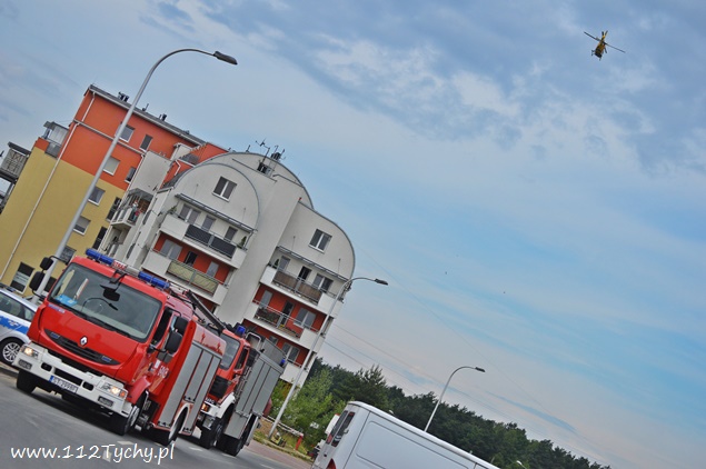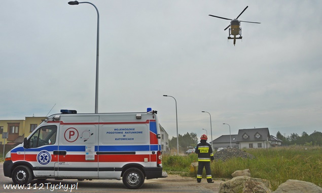 16 czerwca około godziny 10.30 do dyżurnego tyskiej Policji wpłynęło zgłoszenie, że na terenie budowy przy ulicy Żorskiej doszło do wypadku. Ze zgłoszenia wynikało, że jeden z pracowników miał spaść z rusztowania. Na miejsce skierowany został ZRM i patrol prewencji. Jak ustalili przybyli na miejsce policjanci 43 mężczyzna nie spadł z rusztowania, a ze schodów podczas prac związanych z budową ścianek działowych. Będący na miejscu ratownicy medyczni podjęli decyzje o konieczności wezwania na miejsce latającej karetki, która przetransportuje poszkodowanego mężczyznę do specjalistycznego szpitala. W tym celu na miejsce zadysponowany został śmigłowiec HEMS – Ratownik 4 z bazy w Gliwicach. Celem zabezpieczenia lądowiska dla śmigłowca na miejsce zadysponowane zostały dwa zastępy tyskich strażaków (GBA, SCRt). Mężczyzna z urazem głowy i kręgosłupa został przetransportowany do szpitala w Sosnowcu. Policjanci prowadzą dalsze czynności mające na celu wyjaśnienie przyczyn i okoliczności tego wypadku.