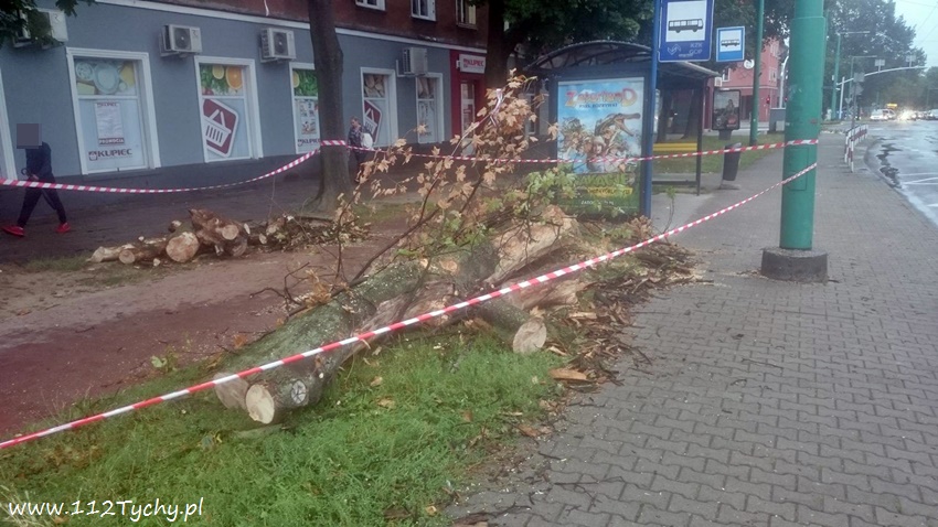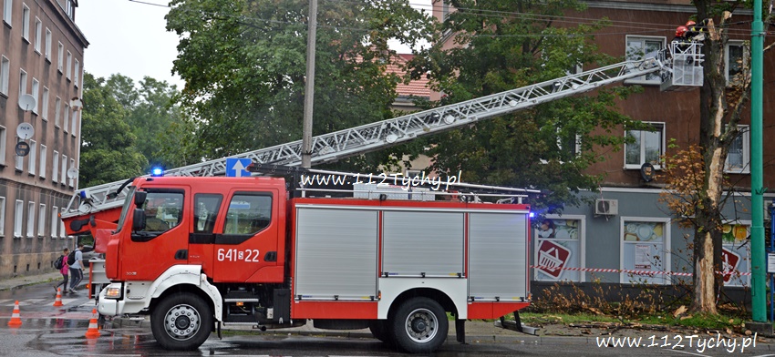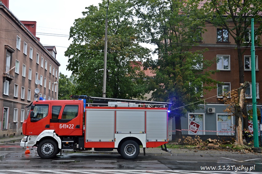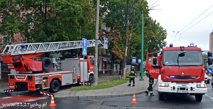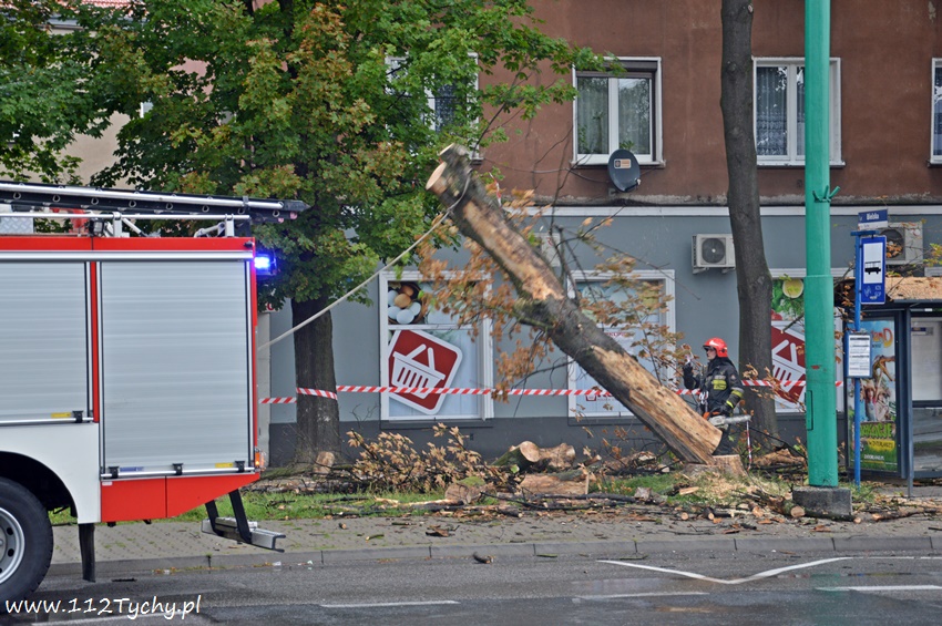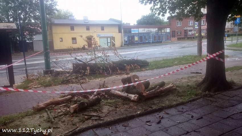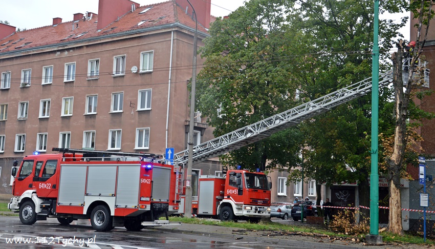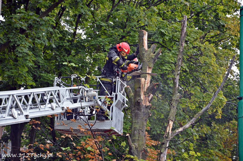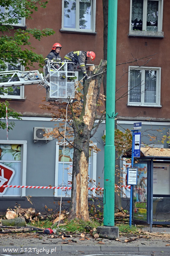 19 sierpnia około godziny 14.45 dyżurny SKKM PSP otrzymał zgłoszenie, że w rejonie przystanku autobusowego przy ulicy Budowlanych jest uschnięte drzewo, które zagraża przechodnim. Na miejsce wysłany został jeden zastęp JRG Tychy (GBA) celem sprawdzenia zgłoszenia. Po dotarciu na miejsce zgłoszenie potwierdziło się, a chodziło o drzewo, które już jakiś czas temu miało zostać usunięte przez firmę odpowiedzialną za utrzymanie zieleni w mieście. Ze względu na zagrożenie KDR zdecydował o konieczności natychmiastowej wycinki. Na miejsce zadysponowany został dodatkowy zastęp z JRG Tychy (SD). Po dotarciu na miejsce i sprawieniu drabiny mechanicznej strażacy przy użyciu pilarek łańcuchowych przystąpili do usuwania konarów i pnia drzewa. Po blisko godzinie drzewo zostało ścięte. Na miejsce wezwani zostali przedstawiciele firmy odpowiedzialnej za utrzymanie zieleni w mieście, którzy mają usunąć pozostałości drzewa i uprzątnąć teren działań. Do tego czasu miejsce gdzie leżą ścinki drzewa zostało odgrodzone.