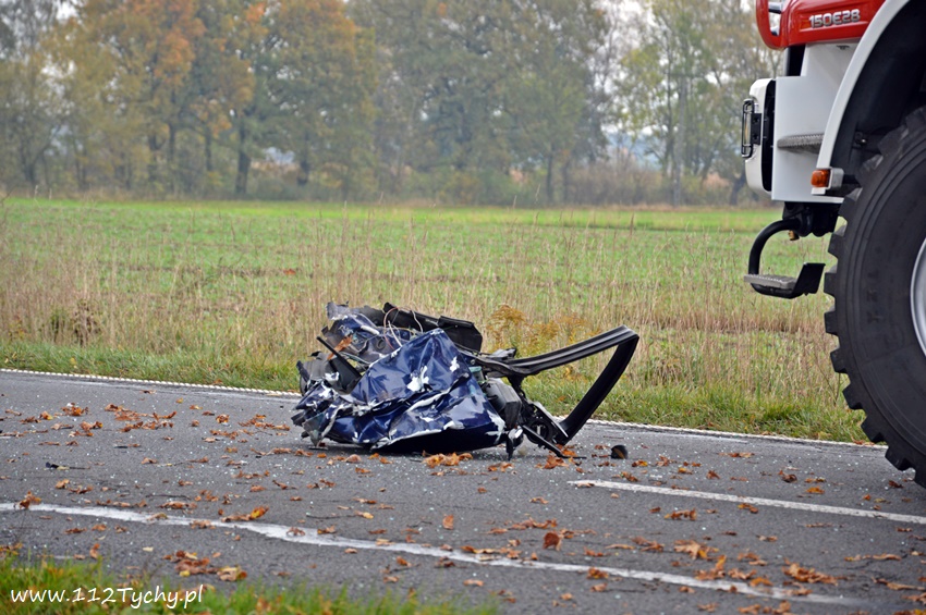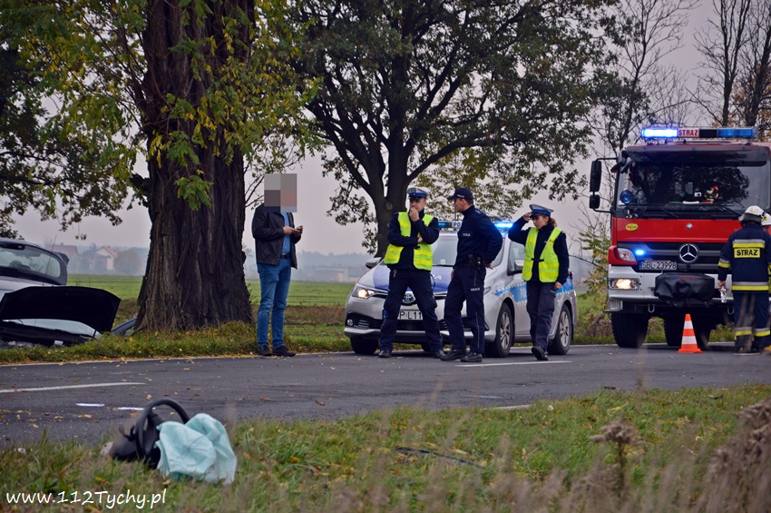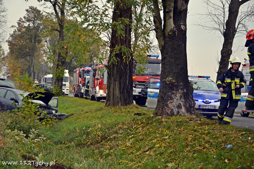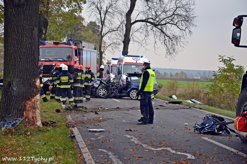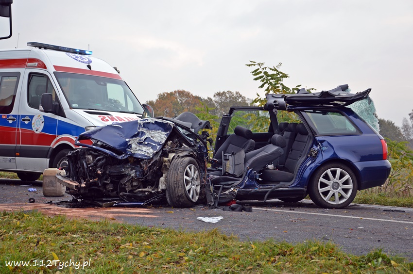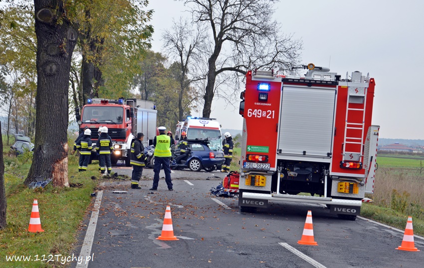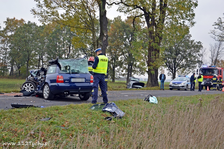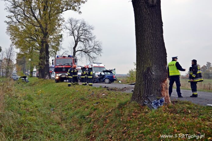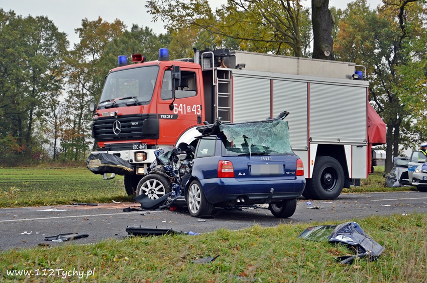 24 października około godziny 9.17 do SKKM PSP Tychy wpłynęło zgłoszenie o zdarzeniu drogowym w Bojszowach na ulicy Gościnnej w rejonie starej dyskoteki. Ze zgłoszenia wynikało, że w zdarzeniu brały udział dwa samochodu osobowe Audi i Dacia, a jeden z kierowców jest zakleszczony w swoim pojeździe. Na miejsce natychmiast zadysponowane zostały zastępy OSP Bojszowy (GBA), OSP Bojszowy Nowe (GBA), JRG Tychy (GBAPr, GCBARt, SCRt), ZRM i patrole bieruńskiej Policji. Po przybyciu na miejsce zgłoszenie potwierdziło się. Strażacy zabezpieczyli miejsce zdarzenia, a następnie przystąpili do udzielania kwalifikowanej pierwszej pomocy poszkodowanym z samochodu Dacia oraz wykonaniu dostępu i ewakuacji poszkodowanego młodego mężczyzny z wraku Audi. Kierowca Audi nieprzytomny z licznymi obrażeniami został przetransportowany do szpitala. Do szpitala przewieziona została również jedna z osób podróżujących Dacią. Ruch w miejscu zdarzenia został całkowicie zablokowany. Bieruńscy Policjanci wyznaczyli objazdy lokalnymi drogami. Trwa ustalanie przyczyn i okoliczności tego zdarzenia. Ze wstępnych ustaleń pracujących na miejscu Policjantów wynika, ze kierujący Audi wyprzedzał Dacię, która uderzyła w jego prawy bok powodując utratę panowania nad pojazdami. Audi z ogromna siłą uderzyło w przydrożne drzewo, a Dacia wypadła z drogi i zatrzymała się kilkanaście metrów dalej w przydrożnym rowie. Na miejsce zadysponowany został śmigłowiec LPR jednak ze względu na złe warunki atmosferyczne został on odwołany. Droga zablokowana była kilka godzin. Dopiero około godziny 14 droga została odblokowana. Na miejsce wypadku dotarli również prokurator i oficer operacyjny z KM PSP Tychy (SLOp). Bieruńscy Policjanci pod nadzorem Prokuratury Rejonowej w Tychach prowadzą dalsze czynności mające na celu wyjaśnienie dokładnych przyczyn i okoliczności tego zdarzenia.