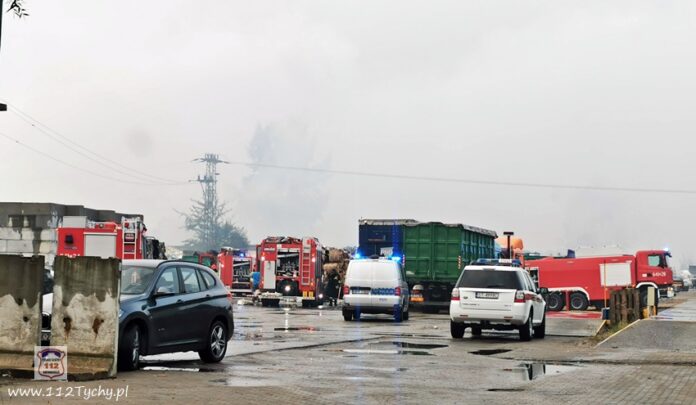 :26 września około godziny 6 dyżurny SK KM PSP Tychy otrzymał zgłoszenie na terenie skupu surowców wtórnych przy ul. Zwierzynieckiej. Na miejsce zgłoszenia zadysponowane zostały zastępy JRG Tychy (GBA, GBAPr, GCBARt, GCBA) oraz patrol Policji. Po dotarciu na miejsce zgłoszenie zostało potwierdzone. Pożarem objęta była sterta makulatury i tworzyw sztucznych w hali namiotowej, która spłonęła. Powierzchnia pożaru zajmowała ok. 40 m2. Na źródło ognia podane zostały prądy wody. Dodatkowo na miejsce przybył d-ca JRG Tychy (SLRr), który przejął dowodzenie działaniami. Przed godziną 8 na miejsce pożaru przyjechał Komendant Miejski PSP Tychy st.bryg. Piotr Szojda (SOp), który przejął dowodzenie. Około godziny 8:20 pożar został opanowany. Po opanowaniu pożaru strażacy wspierani przez pracowników skupu przy użyciu ciężkiego sprzętu przerzucali makulaturę i przelewali. Około południa działania na miejscu zostały zakończone. Na czas działań zabepziecznie rejonu operacyjnego KM PSP Tychy pełniły zastępy OSP Lędziny (GBA) i OSP Bieruń Stary (GCBA).