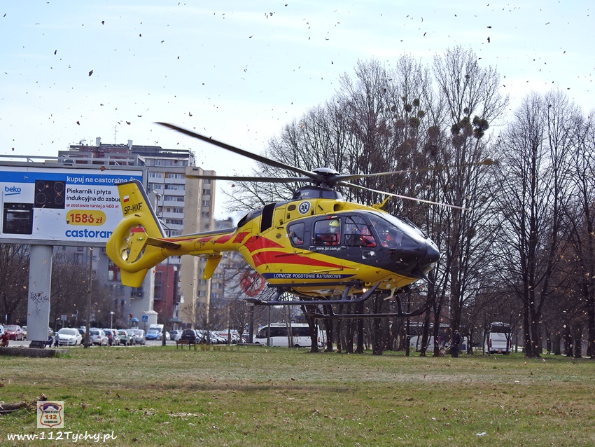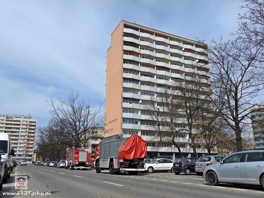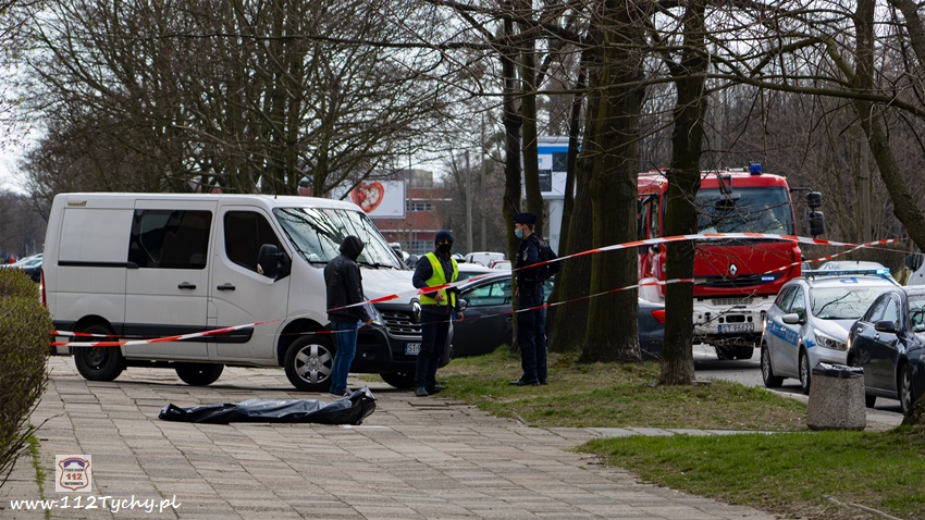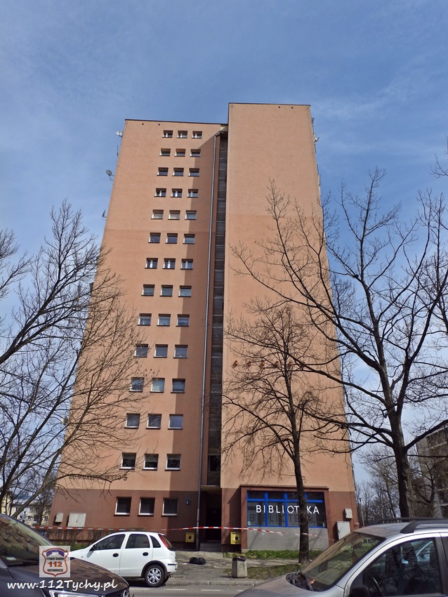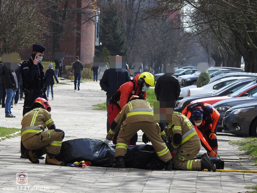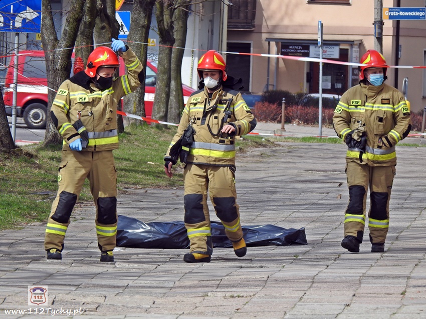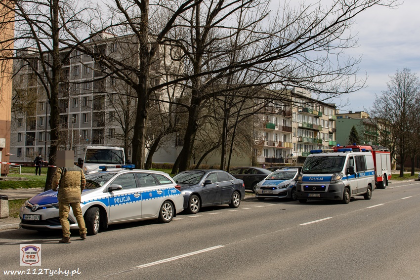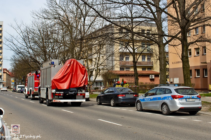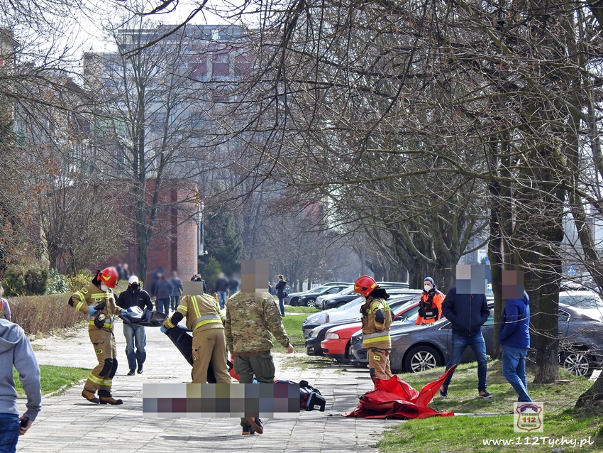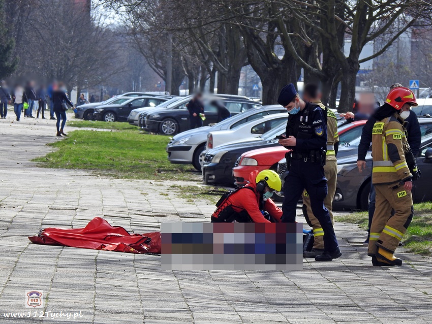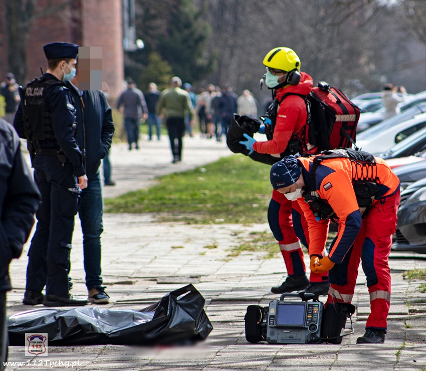 5 kwietnia po godzinie 11 dyżurni KMP Tychy i SK KM PSP Tychy otrzymali zgłoszenie, że na chodniku przy budynku wielorodzinnym na ul. Dąbrowskiego 5 leży mężczyzna. Na miejsce natychmiast wysłany został jeden z podległych patroli, latająca karetka – Ratownik 4 oraz zastępy JRG Tychy (GBA, SCRt). Po przybyciu na miejsce zgłoszenie potwierdziło się. Jak się okazało, mężczyzna (ok. 30 lat) wypadł (wyskoczył) z okna na 13 piętrze klatki schodowej pobliskiego budynku wielorodzinnego. Obrażenia jakich doznał w wyniku upadku okazały się śmiertelne. Lekarz z załogi LPR stwierdził zgon. Miejsce zdarzenia zostało zabezpieczone. Na miejsce wezwany został policyjny technik kryminalistyki, grupa dochodzeniowo – śledcza oraz prokurator. Policjanci KMP Tychy pod nadzorem prokuratury prowadzą dalsze czynności mające na celu wyjaśnienie tego tragicznego zdarzenia.