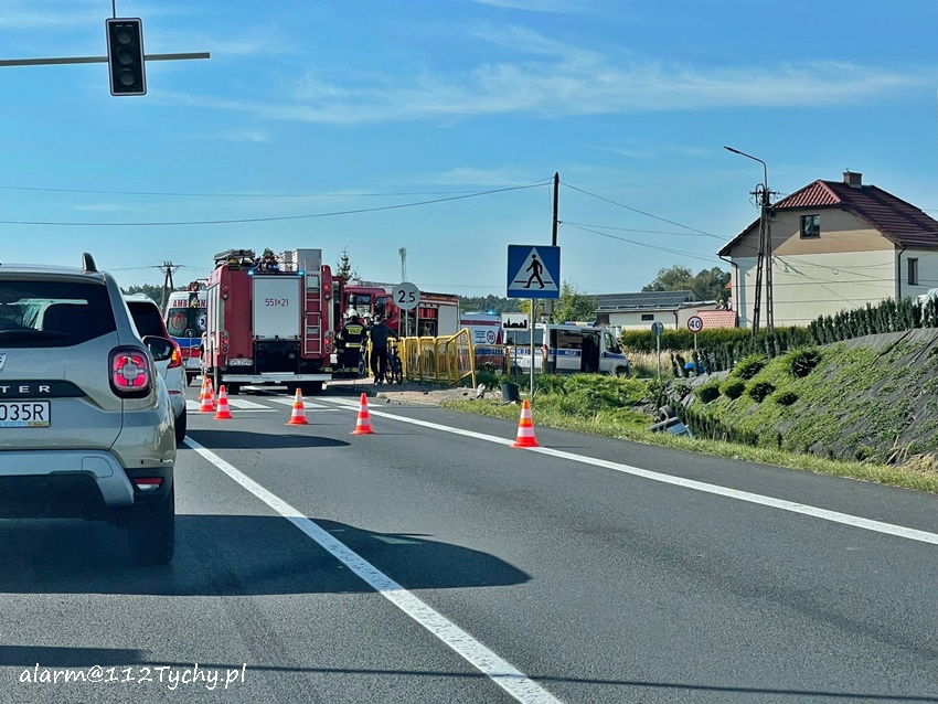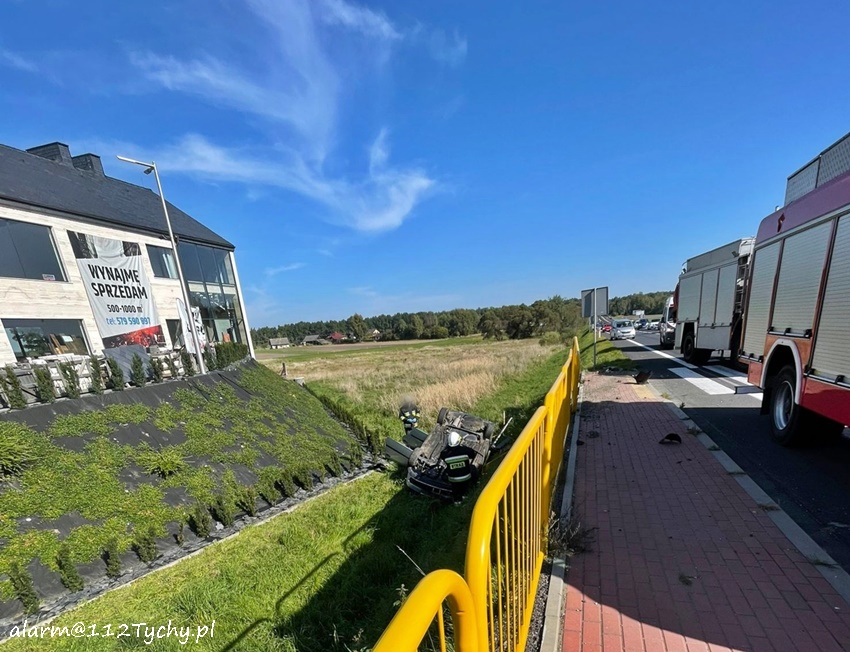 3 października około godziny 11:30 na trasie DK 1 w Kobiórze w rejonie skrzyżowania z ul. Ołtuszewskiego doszło do zdarzenia drogowego z udziałem samochodu osobowego. Osobówka z niewyjaśnionych przyczyn zjechała z drogi do przydrożnego rowu i dachowała. Na miejsce zdarzenia natychmiast zadysponowane zostały służby ratunkowe. Do działań ruszyły zastępy OSP Kobiór (GBARt), JRG Tychy (GBA, SCRt), JRG Pszczyna (GBA), załoga śmigłowca LPR – Ratownik 6, zespoły naziemne PRM oraz patrole Policji z KPP Pszczyna. Samochodem podróżowały dwie osoby dorosłe i dziecko. Cala trójka trafiła pod opiekę ratowników medycznych. Na szczęście ich obrażenia nie były poważne i załoga latającej karetki została odwołana w trakcie dolotu. Na czas działań prawy pas trasy DK 1 w kierunku Pszczyny został zablokowany. Ze wstępnych ustaleń pracujących na miejscu Policjantów wynika, że do zdarzenia doszło w wyniku niezachowania odległości od poprzedzającego pojazdu. Kierujący Seatem mężczyzna (29 lat) chcąc uniknąć uderzenia w tył poprzedzającego pojazdu odbił w prawo i doprowadził do dachowania swojego pojazdu. Kierowca Seata został ukarany mandatem karnym. Utrudnienia w ruchu trwały około godziny.