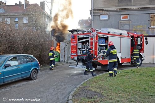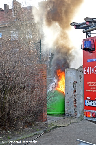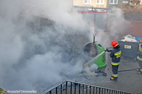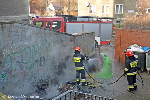 Dzisiaj około 13.30 do MSK w Tychach wpłynęło zgłoszenie o pożarze plastikowego pojemnika na śmieci na ul. Batorego. Na miejsce wysłany został jeden zastęp z JRG Tychy. Po dotarciu na miejsce strażacy zastali objęty ogniem jeden kontener platikowy i nadtopiony kolejny. Przy użyciu szybkiego natarcia pożar został ugaszony a nadtopiony sąsiedni kontener został schłodzony i przelany wodą. Działania trwały 10 minut. Strażacy sprawdzili również okoliczne hydranty. Po około 20 minutach zastęp powrócił do koszar.