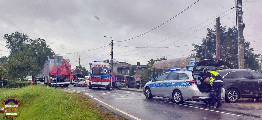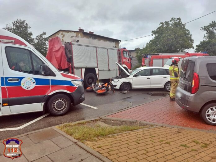 14 września około godziny 15:45 dyżurni KMP Tychy i SK KM PSP Tychy otrzymali zgłoszenie o zdarzeniu drogowym na ul. Mysłowickiej. Ze zgłoszenia wynikało, że doszło do zdarzenia drogowego z udziałem samochodu osobowego i motocyklisty. Na miejsce zdarzenia zadysponowane zostały zastępy KM PSP/JRG Tychy, ZRM oraz patrole Policji. Po przybyciu służb ratunkowych na miejsce ruch został całkowicie wstrzymany. Ze wstępnych ustaleń pracujących na miejscu Policjantów wynika, że sprawcą zdarzenia jest kierowca (68 lat) Skody, który włączając się do ruchu nie ustąpił pierwszeństwa przejazdu kierowcy (31lat) jednośladu (KTM) . Motocyklista z obrażeniami ciała (uraz głowy) trafił pod opiekę ratowników medycznych, a następnie został przetransportowany do szpitala na dokładną diagnostykę. Ze względu na wstępne zakwalifikowanie tego zdarzenia jako wypadek na miejsce wezwany został policyjny technik kryminalistyki. Utrudnienia w ruchu w miejscu zdarzenia trwały blisko dwie godziny. Policjanci KMP Tychy prowadzą dalsze czynności w sprawie tego zdarzenia.