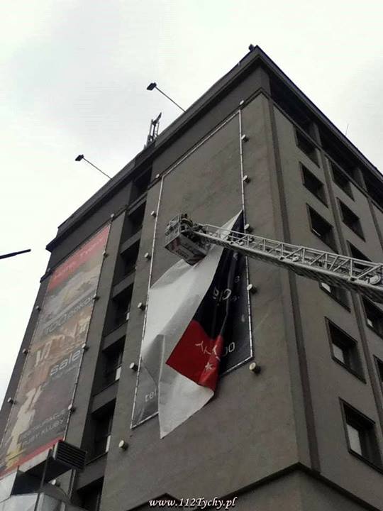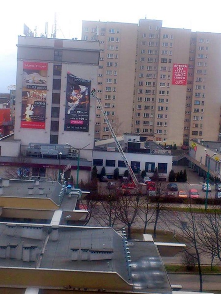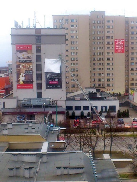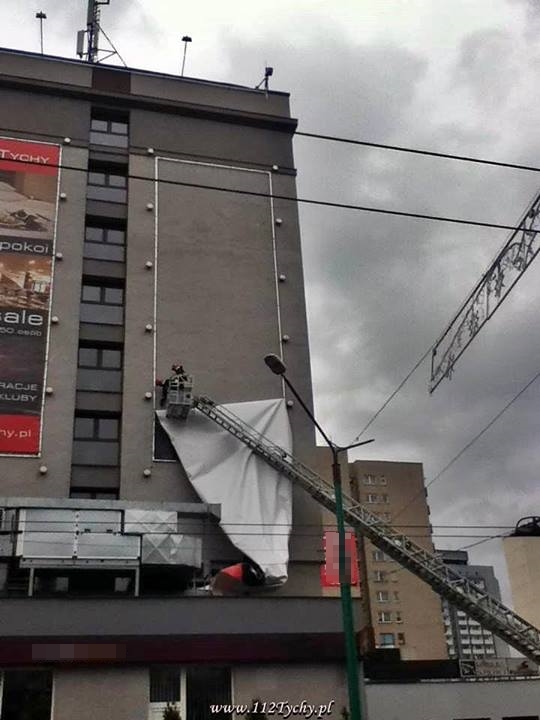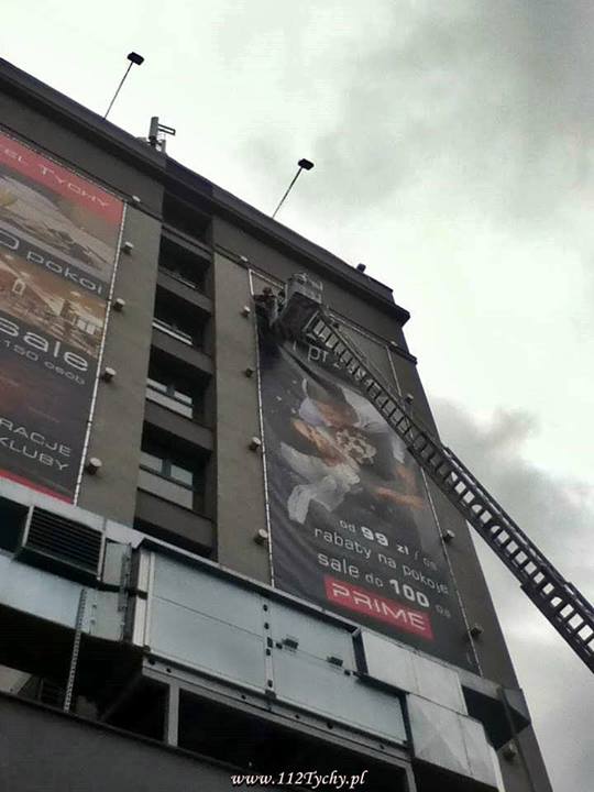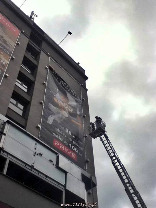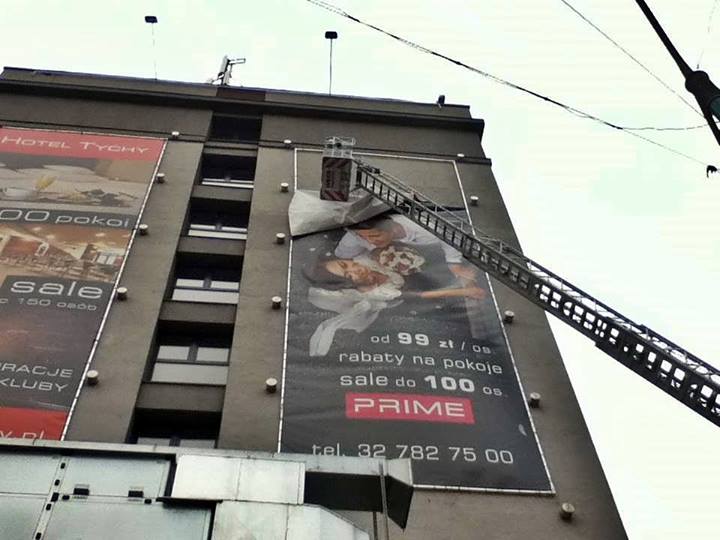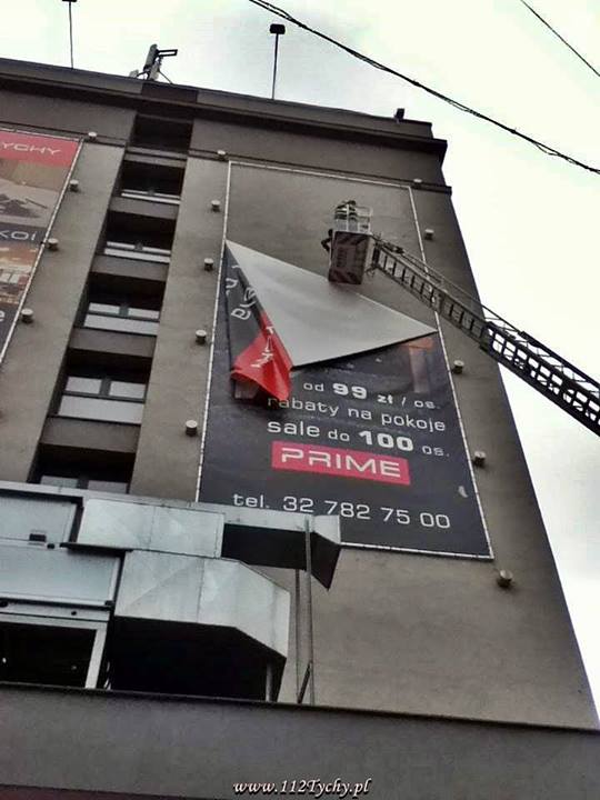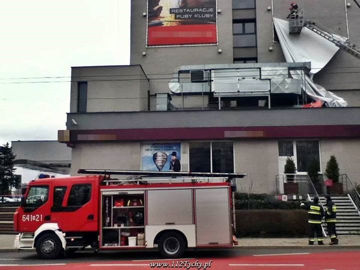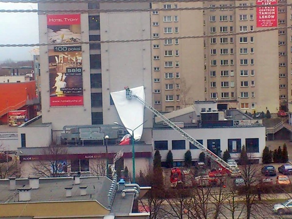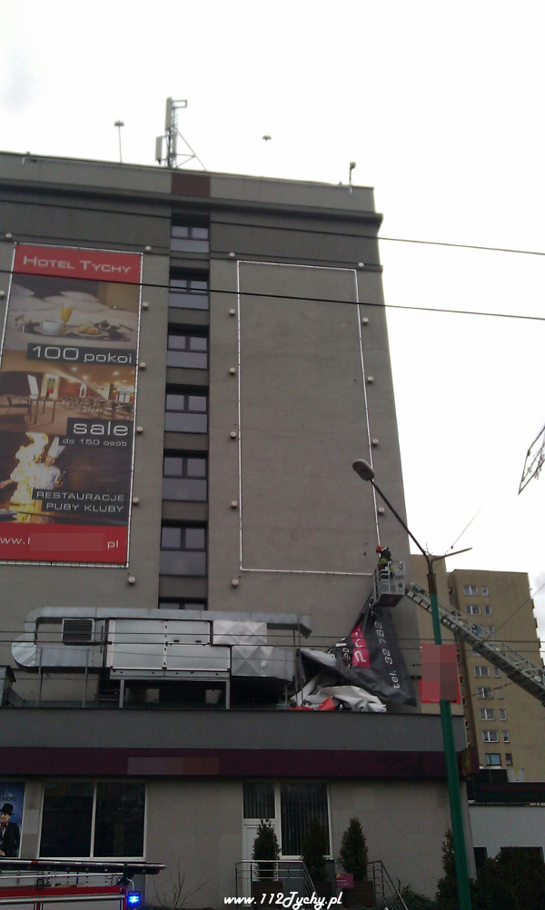 W dniu 12 stycznia około godziny 10:00 wpłynęło zgłoszenie dotyczące zerwanej przez wiatr reklamy wielkoformatowej na budynku „Hotelu Tychy” w Tychach.
