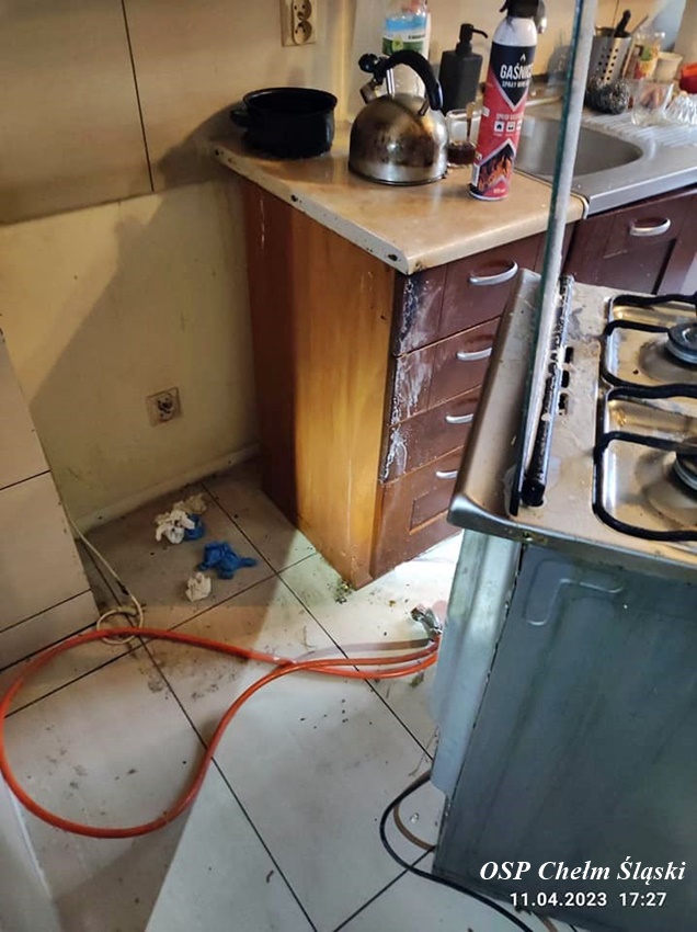 11 kwietnia około godziny 17:10 dyżurny SK KM PSP Tychy otrzymał zgłoszenie o pożarze butli z gazem przy kuchence gazowej w jednym z domów przy ul. Sapety w Imielinie. Na miejsce zgłoszenia natychmiast zadysponowane zostały zastępy OSP Imielin, OSP Chełm Śląski oraz JRG Tychy. Po przybyciu na miejsce okazało się, że pożar został już ugaszony. Uszkodzone zostało przyłącze butli do kuchenki oraz szafka kuchenna. Strażacy zabezpieczyli miejsce zdarzenia oraz wykonali pomiary stężenia gazu w pomieszczeniu. Na szczęście zagrożenie zostało szybko zażegnane. Po około czterdziestu minutach działania zostały zakończone.