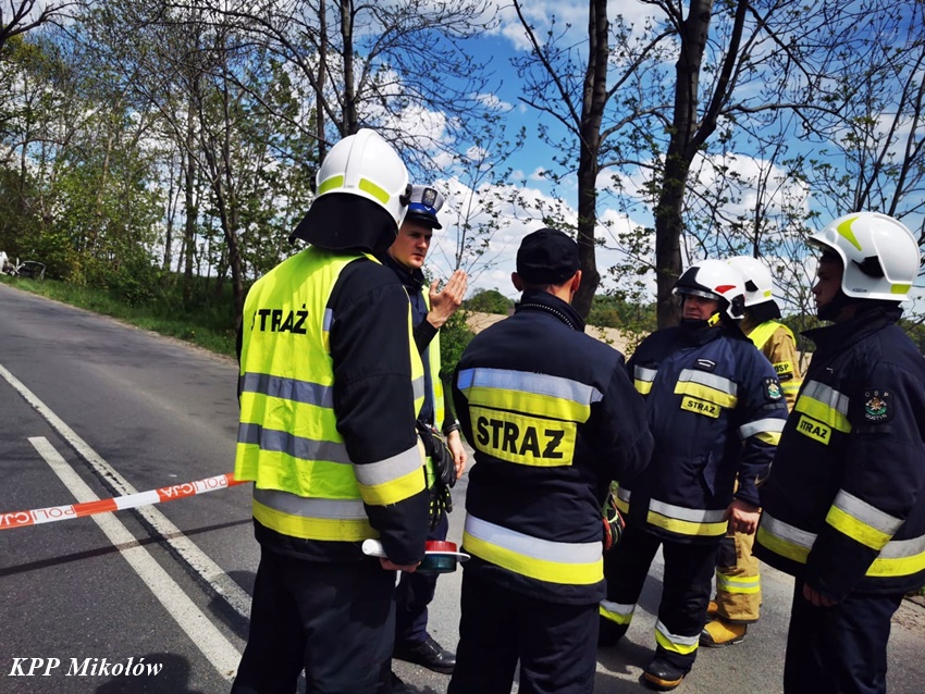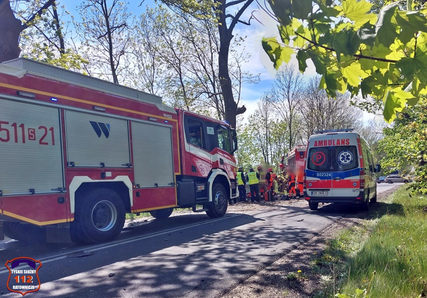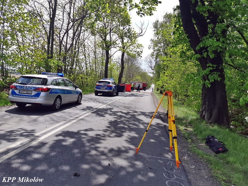 12 maja przed godziną 11 na ul. Pszczyńskiej (DW 928 ) w Wyrach doszło do tragicznego w skutkach wypadku drogowego. Z niewyjaśnionych przyczyn kierujący samochodem marki Fiat Punto Abarth uderzył w przydrożne drzewo. Świadkowie zdarzeni powiadomili o zdarzeniu operatora nr alarmowego 112. Poprzez formatkę zaalarmowane na miejsce zostały: ZRM, zastępy strażaków JRG Mikołów, OSP Gostyń oraz Policja. Na czas działań służb ratunkowych ruch został całkowicie wstrzymany. Niestety po przybyciu służb ratunkowych na miejsce okazało się, że nie ma szans na ratunek dla kierowcy osobówki. Obrażenia okazały się śmiertelne w skutkach. Strażacy przy użyciu narzędzi hydraulicznych wydobyli zwłoki mężczyzny z pojazdu. Na miejsce wezwany został policyjny technik kryminalistyki, grupa dochodzeniowo – śledcza oraz prokurator. Ze wstępnych ustaleń pracujących na miejscu Policjantów wynika, że nie było żadnych śladów hamowania, a w wyniku zdarzenia zginał 34 – letni mieszkaniec Wyr. Po wykonaniu czynności okazało się, że jest konieczne usunięcie części nadłamanych gałęzi korony drzewa w które uderzył samochód. Utrudnienia w ruchu w miejscu zdarzenia trwały ponad trzy godziny. Mikołowscy Policjanci pod nadzorem prokuratury prowadzą dochodzenie w tej sprawie.