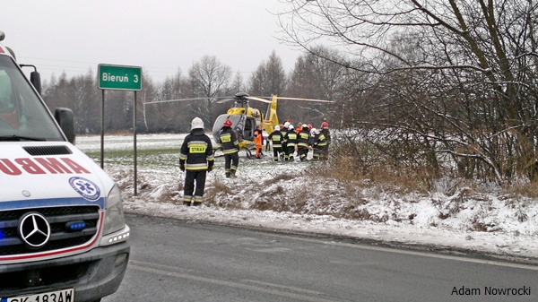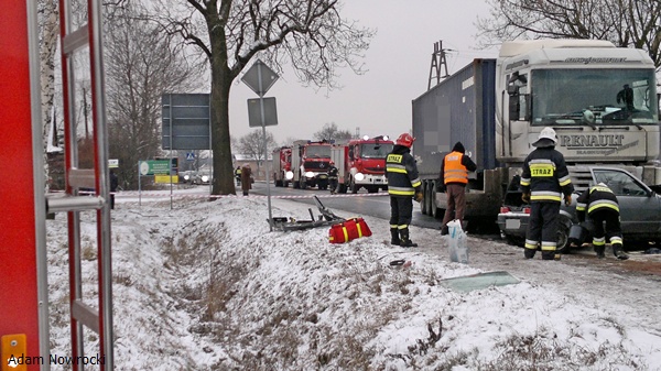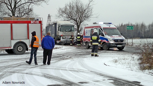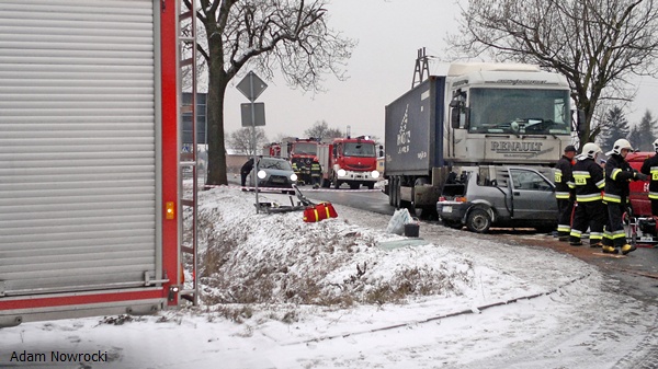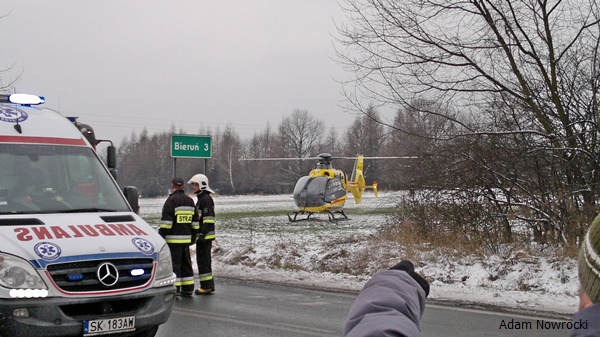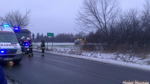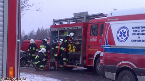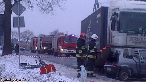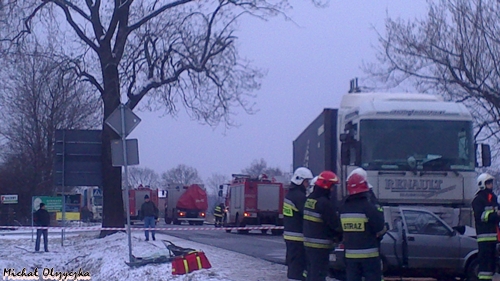 28 stycznia około godziny 13.55 do MSK w Tychach wpłynęło zgłoszenie o wypadku drogowym na ul.Chełmskiej w Chełmie Śląskim. Na miejsce zadysponowane zostały znaczne SiS łącznie 6 zastępów: trzy zastępy z JRG Tychy (GBA, GCBA, SCRT) dwa zastępy z OSP Bieruń Nowy (GBART, SLRt) i jeden zastęp z OSP Chełm Śląski (GBA). Po dotarciu na miejsce ratownicy zastali wypadek drogowy z udziałem samochodu ciężarowego Renault Magnum z naczepą i osobówki – Fiat Cinqecento. W samochodzie osobowym została zakleszczona kobieta kierująca pojazdem. Na miejscu był już zespół pogotowia, który opatrywał ranną kobietę. Działania strażaków polegały na zabezpieczeniu miejsca zdarzenia, uwolnieniu zakleszczonej osoby przy użyciu urządzeń hydraulicznych. Ratownik pogotowia zadecydował o konieczności transportu rannej do szpitala przy użyciu śmigłowca LPR. Po kilku minutach śmigłowiec był na miejscu działań. Strażacy zabezpieczyli lądowisko. Poszkodowana została zabrana śmigłowcem do szpitala. Działania zostały zakończone przed godziną 17. W czasie trwania akcji ratunkowej ul. Chełmska była nieprzejezdna. Dokładne przyczyny i okoliczności tego zdarzenia wyjaśniają przybyli na miejsce policjanci z WRD KPP w Bieruniu.