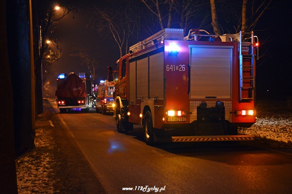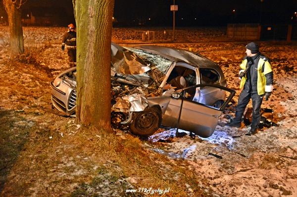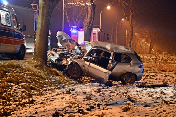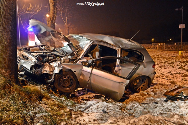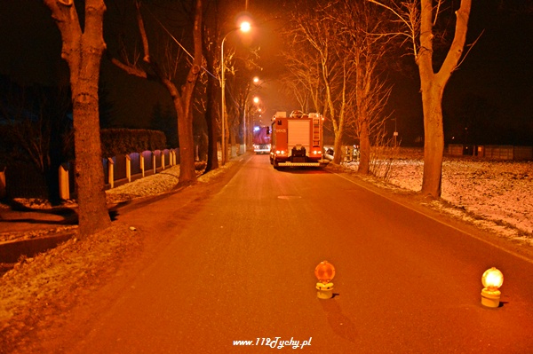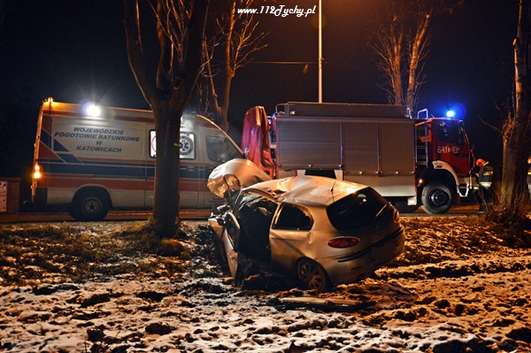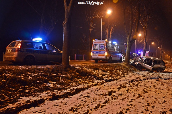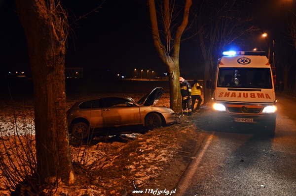 31 stycznia około godziny 23.20 do dyżurnego tyskiej Policji oraz do MSK w Tychach wpłynęło zgłoszenie o zdarzeniu drogowym na ul. Czarnej. Na miejsce zadysponowane zostały trzy zastępy z JRG Tychy (GBA, GCBA, SCRT), patrol WRD Policji oraz karetka pogotowia ratunkowego. Po dotarciu na miejsce służby zastały rozbity na przydrożnym drzewie samochód osobowy Alfa Romeo 147. Jak się okazało pojazdem tym podróżowało w sumie czterech młodych mężczyzn. Wszyscy zostali przebadani na miejscu przez ZRM. Miejsce zdarzenia zostało zabezpieczone przez strażaków, a dodatkowo ich działania polegały na odłączeniu zasilania w rozbitym samochodzie. Ratownicy pogotowia podjęli decyzję o konieczności przewiezienia dwóch osób do szpitala na dokładniejsze badania.Ze względu na licznie przybyłych na miejsce zdarzenia powiadomionych opiekunów funkcjonariusze poprosili o dodatkowe patrole. Prawdopodobną przyczyną zdarzenia była utrata panowania nad pojazdem. Samochód otarł się o jedno z drzew i przodem uderzył w kolejne. Do godziny 0.30 ul. Czarna w miejscu zdarzenia była całkowicie nieprzejezdna. Działania zostały zakończone około godziny 1.00. Dalsze czynności prowadzą Policjanci z WRD KMP Tychy.