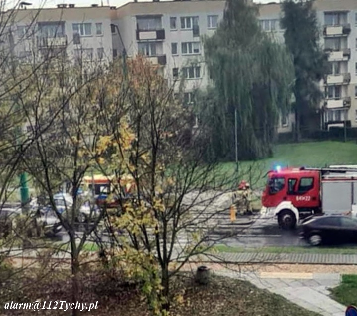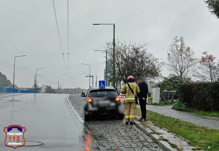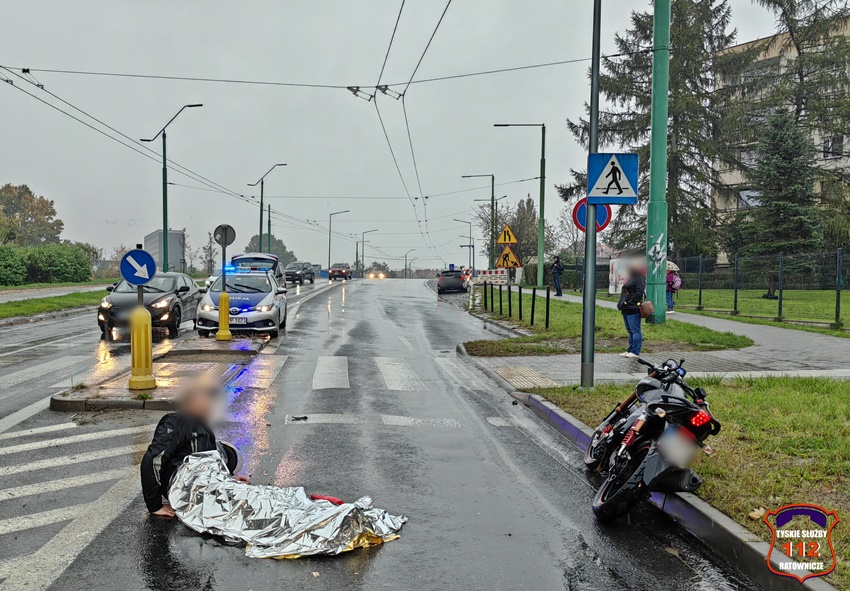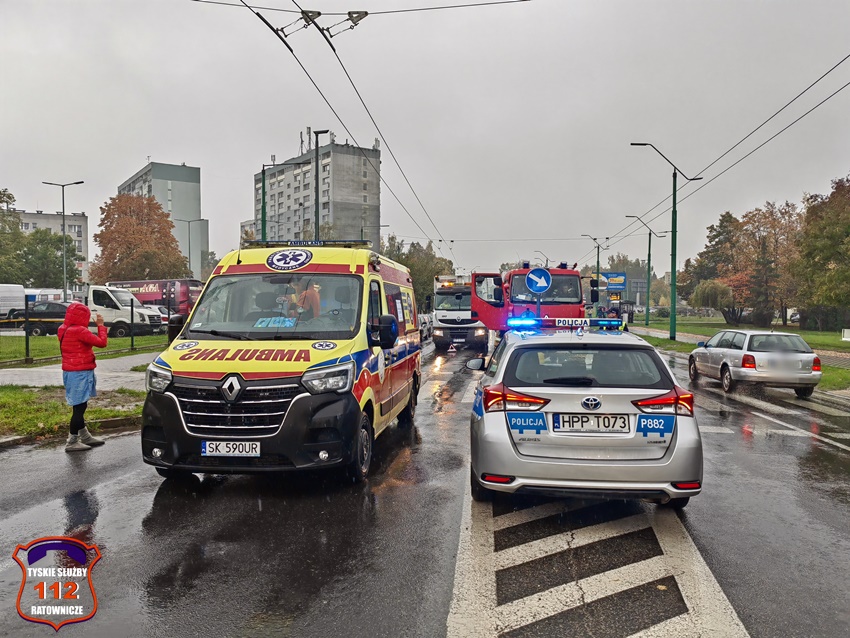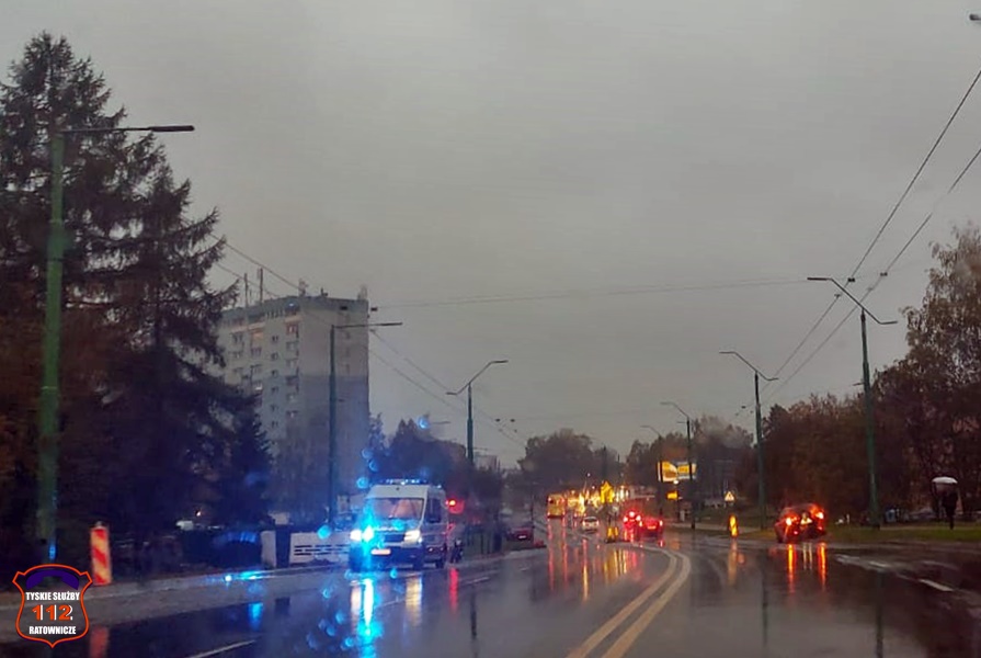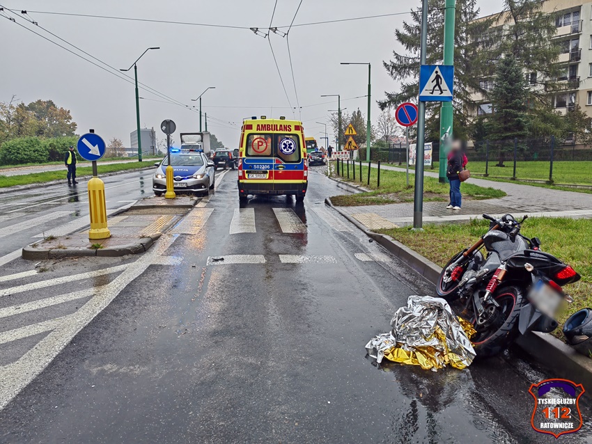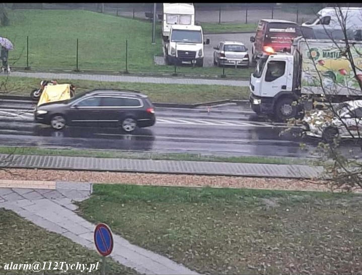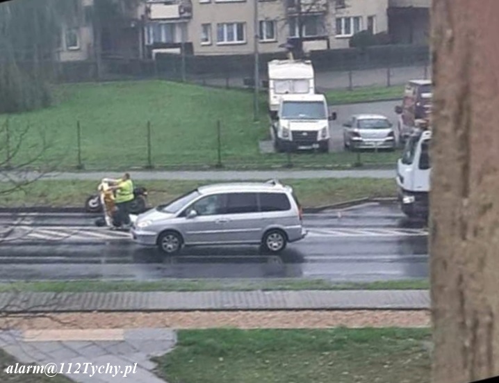 27 października około godziny 15:15 na ul. Harcerskiej doszło do zdarzenia drogowego z udziałem samochodu nauki jazdy (Toyota Yaris) i motocykla (Keeway). Na zdarzeni najechali patrolujący miasto tyscy Policjanci. O zdarzeniu poinformowali oni dyżurnego, który na miejsce zadysponował ZRM oraz dodatkowe patrole Policji. Przed przyjazdem służb ratunkowych w miejscu zdarzenia zatrzymała się ekipa śmieciarki z firmy Master Odpady i Energia Sp. z.o.o. Będący na miejscu Policjanci wprowadzili ręczną regulację ruchem, a kierowca śmieciarki (strażak – ratownik z OSP) zabezpieczył poszkodowanego, udzielając mu wsparcia psychicznego i ze względu na długi czas dojazdu ZRM poprzez dyżurnego SK KM PSP Tychy wezwał na miejsce zastęp strażaków JRG Tychy. Po przybyciu na miejsce ratowników medycznych poszkodowany motocyklista z urazem nogi został im przekazany, a następnie został przetransportowany do tyskiego szpitala. Przybyli na miejsce strażacy zabezpieczyli uszkodzony motocykl. Ze wstępnych ustaleń pracujących na miejscu Policjantów, kierujący jednośladem nie dostawał prędkości do panujących warunków atmosferycznych i chcąc uniknąć bezpośredniego uderzenia w tył osobówki „położył” swoją maszynę. W wyniku tego zdarzenia motocyklista doznał urazu lewej nogi w okolicy stawu kolanowego (podejrzenie złamania). Pracujący na miejscu Policjanci przebadali motocyklistę alkomatem, wynik to 0,72mg/l co daje ponad 1,5 promila w wydychanym powietrzu, a dodatkowo nie posiada uprawnień do kierowania pojazdami mechanicznymi. Jednoślad został zabezpieczony i odholowany na policyjny parking. Utrudnienia w ruchu w miejscu zdarzenia trwały blisko dwie godziny. Policjanci KMP Tychy prowadzą dalsze postępowanie w tej sprawie.