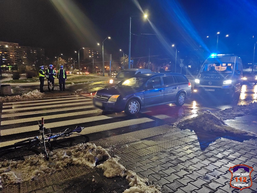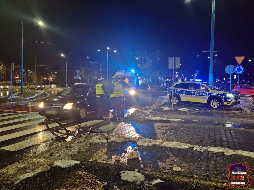 11 grudnia około godziny 16:35 na oznakowanym przejściu dla pieszych z wyznaczonym przejazdem rowerowym przy rondzie Polonia (al. Jana Pawła II – al. Bielska – ul. Żwakowska) doszło do potrącenia rowerzysty przez kierującą osobowym Oplem. Na miejsce zdarzenia wezwane zostały patrole Policji oraz ZRM. Z pomocą rowerzyście pospieszył kierowca jednej z tyskich pomocy drogowych, który dodatkowo zabezpieczył miejsce zdarzenia. Poszkodowany rowerzysta (20 lat) z urazem głowy trafił pod opiekę ratowników medycznych, a następnie został przetransportowany do szpitala na dokładną diagnostykę. Na czas działań lewy pas w kierunku al. Piłsudskiego został zablokowany. Ze wstępnych ustaleń pracujących na miejscu Policjantów jak i nagrania z videorejestratora (z osobówki) wynika, że sprawczynią zdarzenia jest kierująca osobówką kobieta, która uderzyła w rowerzystę, który już opuszczał przejście dla pieszych. Policjanci KMP Tychy prowadzą dalsze postępowanie w sprawie tego zdarzenia.