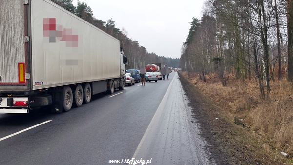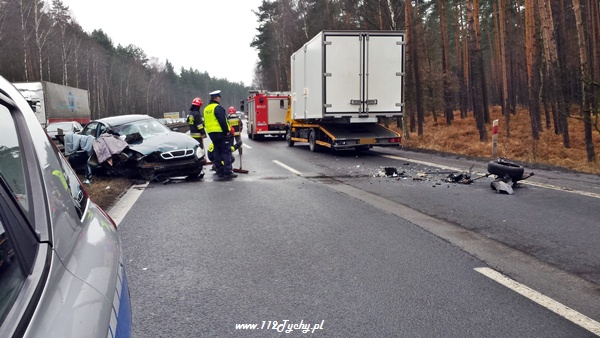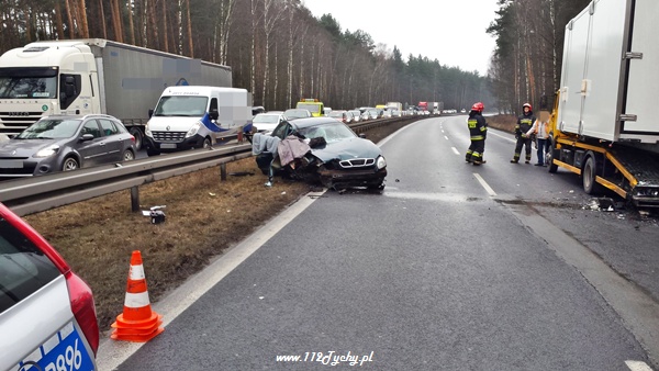 22 lutego około godziny 11.30 na DK1 doszło do wypadku drogowego z udziałem Daewoo Lanos i lawety. Na lawecie przewożona była zabudowa, która się przesunęła. Kierujący lawetą zatrzymał się na pasie awaryjnym i poprawił ładunek. W lawecie włączone były światła awaryjne oraz wystawiony był trójkąt ostrzegawczy. Jednak jadący w tym samym kierunku kierujący Lanosem nie zauważył i uderzył w tył lawety Na miejsce zadysponowane zostały dwa zastępy z JRG Tychy (GBA, SCRt) patrole Policji i karetka pogotowia. Przybyły na miejsce służby natychmiast przystąpiły do działań. Policja zamknęła DK1 na wysokości zjazdu na ul. Sikorskiego i tamtędy był przeprowadzony objazd do al. Bielskiej. Policjanci wspomagani byli przez funkcjonariuszy tyskiej Straży Miejskiej. Działania pozostałych służb polegały na zabezpieczeniu miejsca zdarzenia, udzieleniu pomocy osobom poszkodowanym z samochodu osobowego, odłączeniu akumulatora w rozbitym pojeździe orz usunięciu szczątków rozbitych pojazdów. Siła uderzenia była ogromna. Z samochodu osobowego wyrwane zostało przednie zawieszenie. Poszkodowana została pasażerka samochodu osobowego i została przetransportowana do szpitala. Na miejsce przyjechał również patrol Policji z KPP w Pszczynie.Przez ponad 2 godziny DK1 w kierunku Pszczyny była całkowicie zablokowana. Około godziny 13.20 działania służb zostały zakończone i ruch został odblokowany. Uszkodzone pojazdy zostały odholowane.Dokładne okoliczności wypadku badają funkcjonariusze Policji.