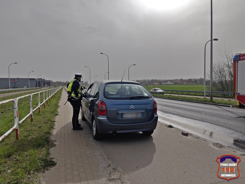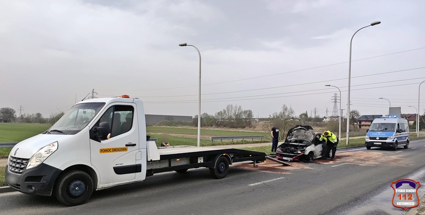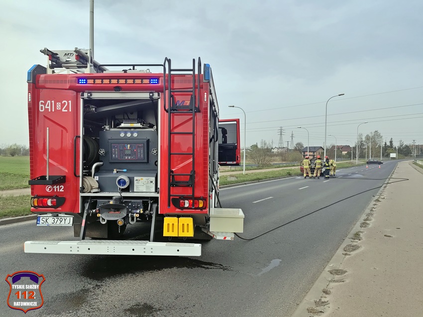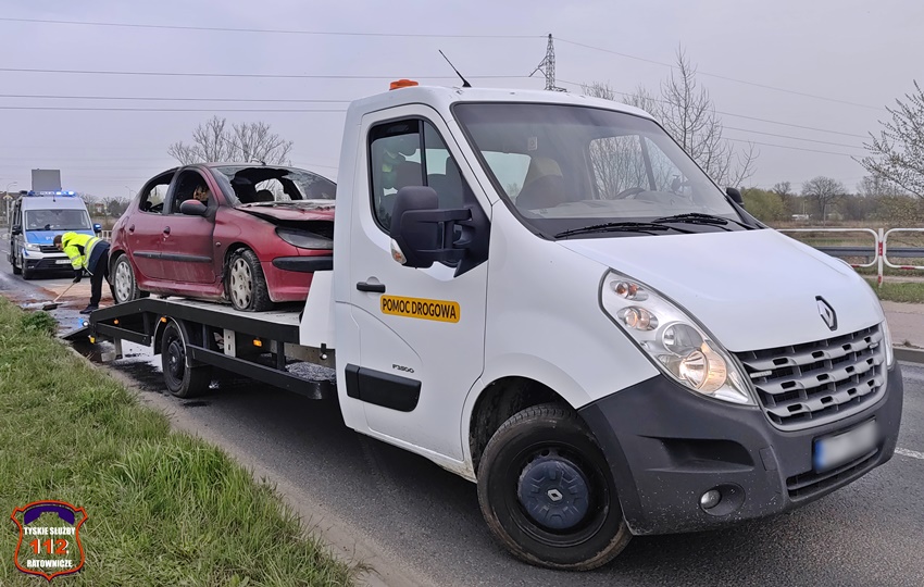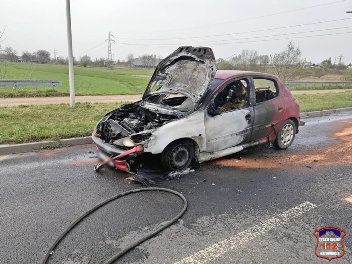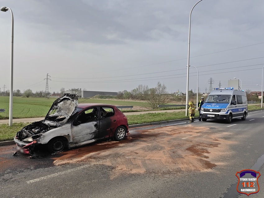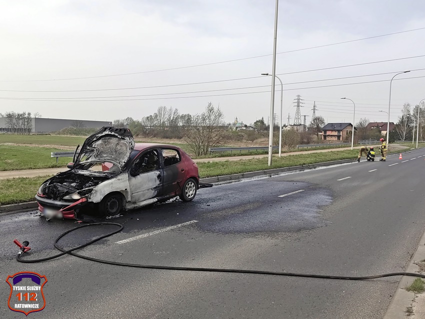 31 marca około godziny 15 dyżurny SK KM PSP Tychy otrzymał zgłoszenie o pożarze samochodu osobowego marki Peugeot na łączniku ul. Serdeczna – Oświęcimska (równoległa do ul. Przejazdowej). Na miejsce zgłoszenia zadysponowany został zastęp strażaków JRG Tychy oraz Policja. Po przybyciu na miejsce zgłoszenie zostało potwierdzone. Pojazd w całości był objęty pożarem. Strażacy w aparatach ochrony układu oddechowego podali prąd wody w natarciu. Osoby podróżujące pojazdem ( rodzice i dwójka dzieci) opuścili bezpiecznie pojazd. W trakcie działań ruch był całkowicie zablokowany. Niestety nie wszyscy kierowcy rozumieli zagrożenie oraz wykazali zrozumienie w związku z zaistniałą sytuacją i próbowali ominąć zablokowaną drogę jadąc chodnikiem. Odbyli oni pouczającą rozmowę z funkcjonariuszami Policji będącymi na miejscu. Po ugaszeniu pożaru strażacy sprawdzili wrak używając kamery termowizyjnej. Dodatkowo strażacy przy użyciu sorbentu zneutralizowali plamę płynów eksploatacyjnych, które wyciekły z wraku pojazdu. Wrak pojazdu został odholowany przez pomoc drogową, a uprzątnięciem drogi zajęła się firma odpowiedzialna za jej utrzymanie. Działania na miejscu trwały około godziny.