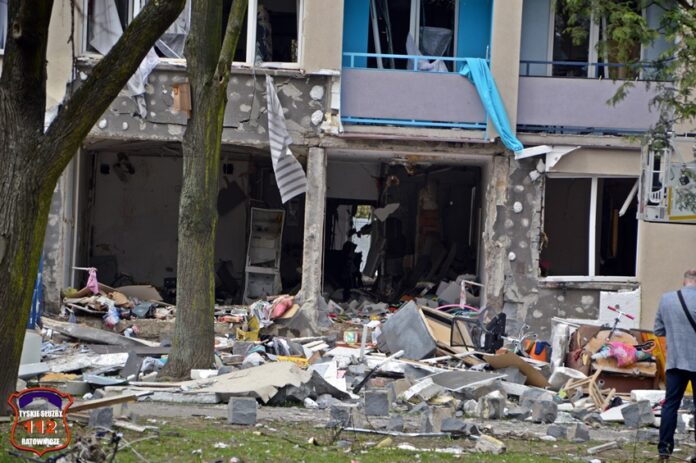 1 kwietnia około godziny 9:20 na terenie Tychów słyszalny był odgłos wybuchu. O godzinie 9:24 dyżurny SK KM PSP Tychy otrzymał zgłoszenie, że doszło do wybuchu gazu w jednym z mieszkań w budynku wielorodzinnym przy ul. Darwina 4. Na miejsce zgłoszenia zadysponowane zostały zastępy strażaków JRG Tychy oraz ZRM i Policja. Po przybyciu na miejsce pierwszych podmiotów ratunkowych okazało się, że sytuacja jest bardzo poważna. Na miejsce wezwane zostały dodatkowe siły i środki służb ratunkowych: dodatkowe ZRM zastępy strażaków OSP Lędziny, OSP Bojszowy, OSP Bieruń Stary, załoga Lotniczego Pogotowia Ratunkowego oraz dodatkowe patrole Policji celem zabezpieczenia miejsca zdarzenia. Z budynku ewakuowanych zostały 23 osoby, siedem z nich (w tym dwoje dzieci) trafiło do szpitali. Najciężej ranny mężczyzna, który został dosłownie wyrzucony z mieszkania, z licznymi poparzeniami (ok. 80% ciała) drogą lotniczą został również przetransportowany do szpitala. Po zakończeniu akcji ratowniczej działania prowadził nadzór budowlany oraz policyjna grupa dochodzeniowo – śledcza. Około godziny 16 zastępy strażaków zostały częściowo odesłane do koszar, a na miejsce dostarczone zostały kontenery (firma Master), do których usuwany jest gruz. Na miejscu pracują również przedstawiciele MZBM Tychy. W trakcie działań rejon operacyjny KM PSP Tychy zabezpieczały zastępy strażaków OSP Lędziny, OSP Bieruń Stary oraz OSP Bojszowy Nowe.