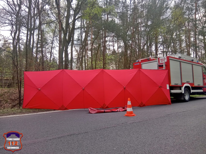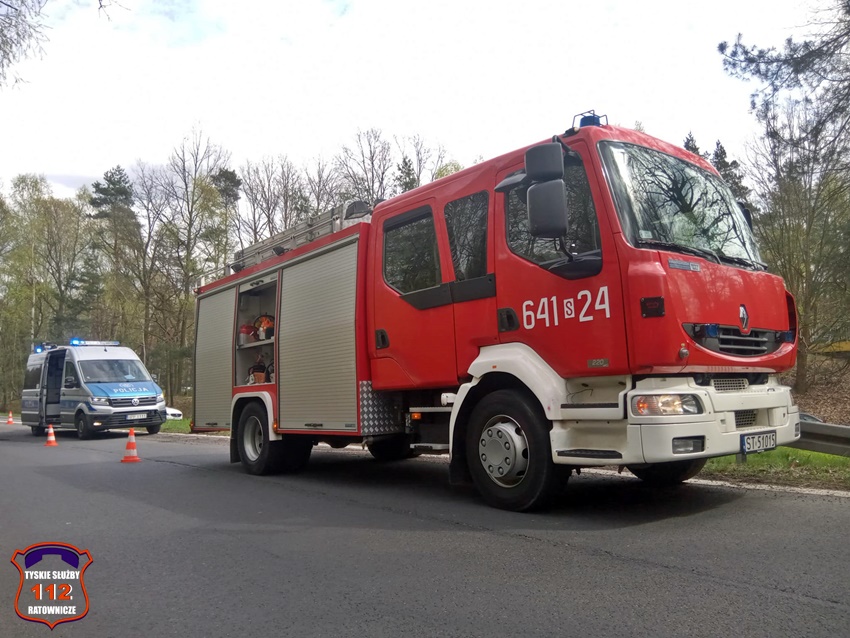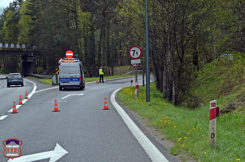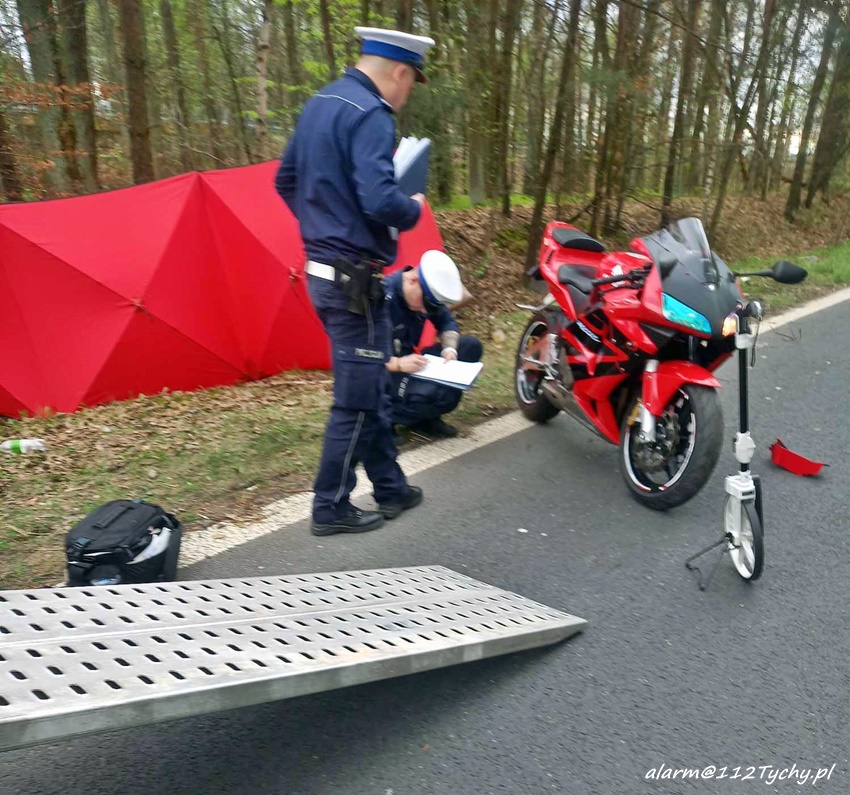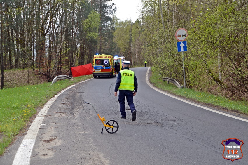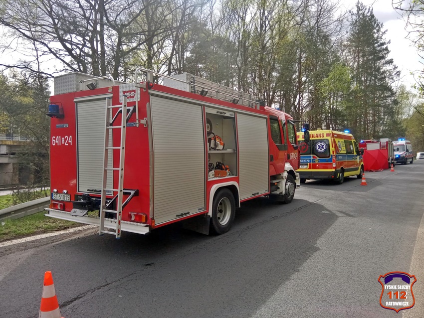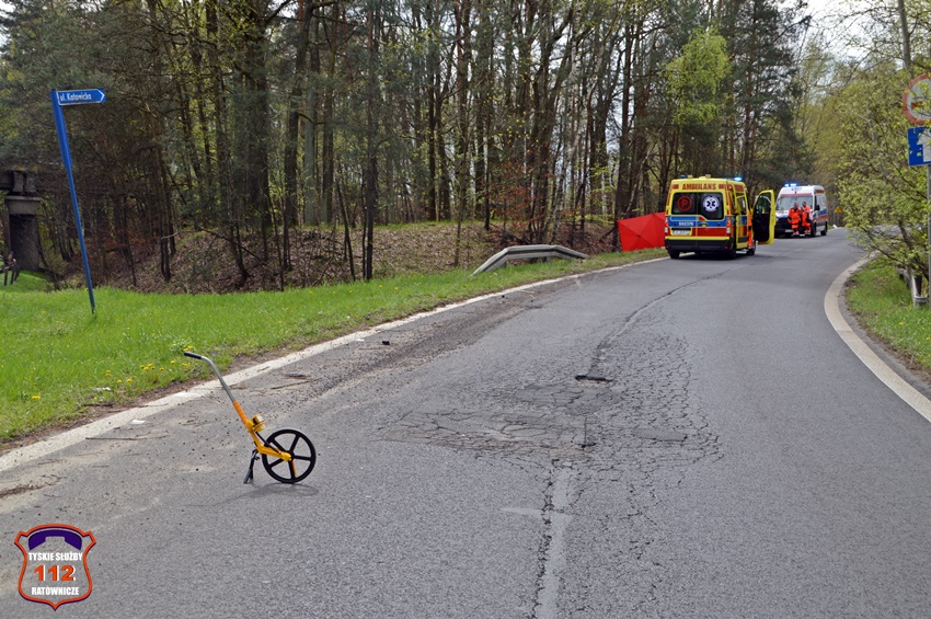 6 kwietnia około godziny 12:20 dyżurny SK KM PSP Tychy otrzymał zgłoszenie o wypadku z udziałem motocyklisty w rejonie zjazdu z trasy DK 86 na ul. Katowicką. Ze zgłoszenia wynikało, że u mężczyzny doszło do zatrzymania krążenia. Na miejsce zdarzenia zadysponowane zostały: zastępy strażaków JRG Tychy, ZRM oraz Policja. Przed przybyciem służb z pomocą poszkodowanemu motocykliście pospieszyli świadkowie zdarzenia. Niestety pomimo wdrożenia medycznych czynności ratunkowych nie udało się przywrócić funkcji życiowych 43 – letniemu mężczyźnie (mieszkaniec Tychów). Na miejsce wezwany został policyjny technik kryminalistyki oraz prokurator. Na czas działań droga została zablokowana. Ze wstępnych ustaleń pracujących na miejscu Policjantów jak i relacji świadków zdarzenia wynika, że kierujący motocyklem marki Honda mężczyzna wyprzedzał ciąg pojazdów i „złapał” pobocze, po czym utracił panowanie nad jednośladem i wpadł do przydrożnego rowu i zagajnika. Policjanci KMP Tychy prowadzą postępowanie w tej sprawie.