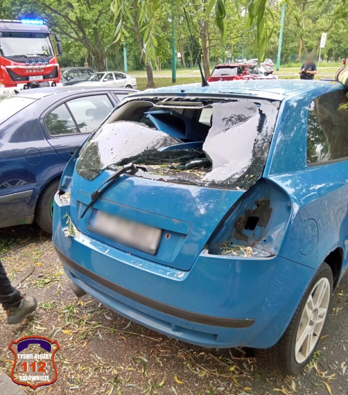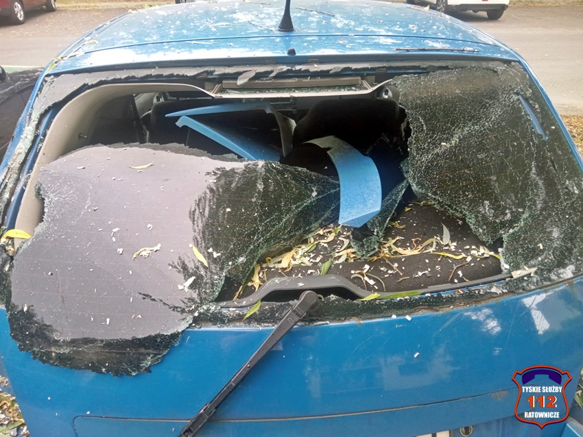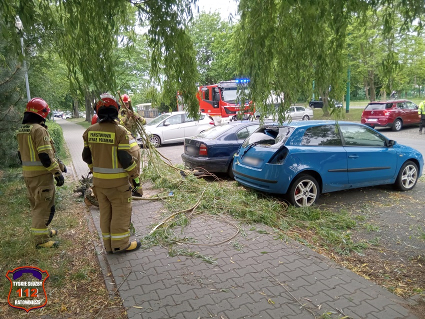 17 maja przed godziną 13 dyżurny SK KM PSP Tychy otrzymał zgłoszenie, że na parkingu osiedlowym w ciągu ul. Armii Krajowej gałęzie spadły na zaparkowane samochody. Na miejsce zgłoszenia natychmiast zadysponowany został zastęp strażaków JRG Tychy oraz patrol Policji. Po przybyciu na miejsce zgłoszenia zostało ono potwierdzone. Gałęzie spadły na Fiata oraz Skodę. W Fiacie wybita została tylna szyba. Strażacy uprzątnęli połamane gałęzie, a Policjanci ustalali właściciela pojazdów. Działania na miejscu trwały około godziny.