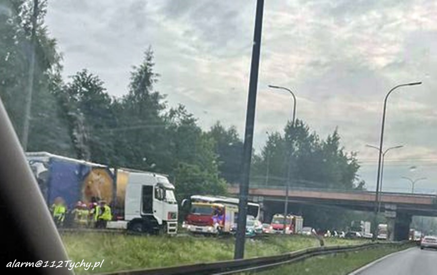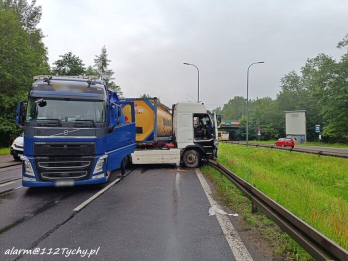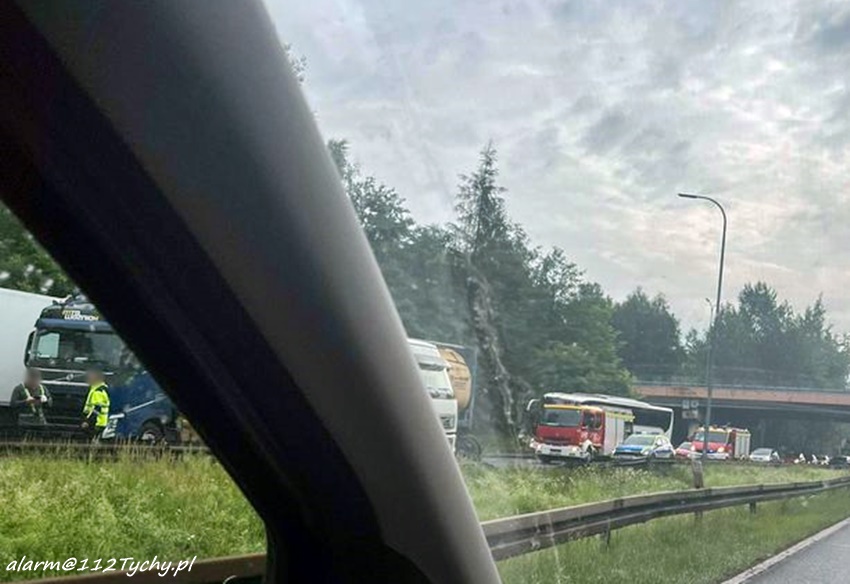 10 czerwca około godziny 5:50 na trasie DK 86 w rejonie węzła z ul. Boya – Żeleńskiego w kierunku Pszczyny doszło do zdarzenia drogowego z udziałem dwóch ciągników siodłowych marki Volvo z naczepami. W wyniku zderzenia jeden z zestawów „złamał się” i zablokował całkowicie trasę. Na miejsce zdarzenia zadysponowane zostały zastępy tyskich strażaków oraz policyjne patrole. Ze wstępnych ustaleń pracujących na miejscu Policjantów wynika, że do zdarzenia doszło w momencie gdy jeden z kierowców zagapił się i uderzył w zestaw, który omijał stojący na poboczu samochód ciężarowy, w którym doszło do awarii (uszkodzone koło). Uczestnicy zdarzenia wezwali na miejsce holowniki pomocy drogowej, której pracownicy zajęli się usunięciem pojazdów i udrożnieniem ruchu. Działania na miejscu trwały około czterech godzin. Policjanci KMP Tychy prowadzą dalsze postępowanie w tej sprawie.
