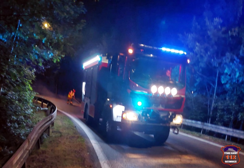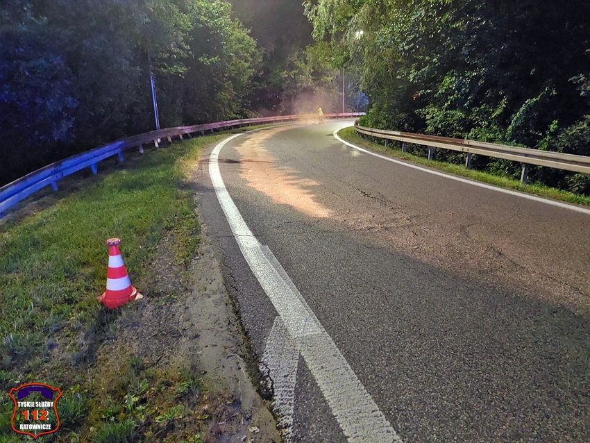 11 lipca około godziny 22:25 dyżurny KMP Tychy otrzymał zgłoszenie o zdarzeniu drogowym na zjeździe z trasy DK44 na DK1 w kierunku Bielska Białej. Ze zgłoszenia wynikało, że kierowca osobowego Opla utracił panowanie nad pojazdem i wjechał do rowu. Na miejsce zdarzenia zadysponowane zostały: Policja oraz zastęp strażaków JRG Tychy. Jak się okazało po przybyciu na miejsce przyczyną poślizgu była rozległa plama substancji ropopochodnej, która ciągnęła się od trasy DK 44, poprzez trasę DK1, aż do al. Niepodległości. Po około godzinie pojazd został wyciągnięty z rowu przez wezwaną na miejsce pomoc drogową. Strażacy następnie zajęli się neutralizacją plamy.