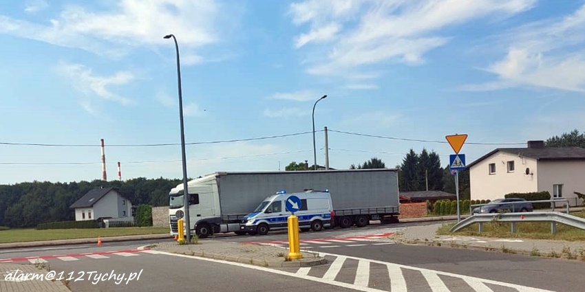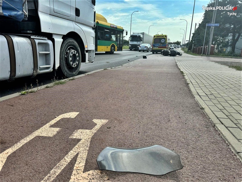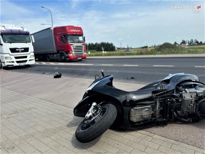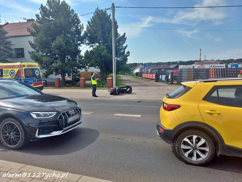 19 lipca około godziny 10 na ul. Oświęcimskiej w rejonie skrzyżowania z ul. Imbirową doszło do zdarzenia drogowego z udziałem kierującego skuterem marki Piaggio. Kierujący jednośladem wyprzedzał ciąg pojazdów i chcąc uniknąć czołowego zderzenia z jadącym z naprzeciwko ciągnikiem siodłowym uderzył w wysepkę rozdzielającą pasy ruchu. Po uderzeniu w wysepkę kierujący utracił panowanie nad jednośladem i przewrócił się. Na miejsce zdarzenia wezwane zostały: ZRM, zastęp strażaków JRG Tychy oraz Policja. W trakcie działań w miejscu zdarzenia wprowadzony został ruch wahadłowy kierowany przez funkcjonariuszy PSP Tychy oraz WRD KMP Tychy. Kierujący skuterem mężczyzna (52 lata) z obrażeniami ciała został przewieziony do szpitala. Policjanci KMP Tychy prowadzą postępowanie w tej spawie.
