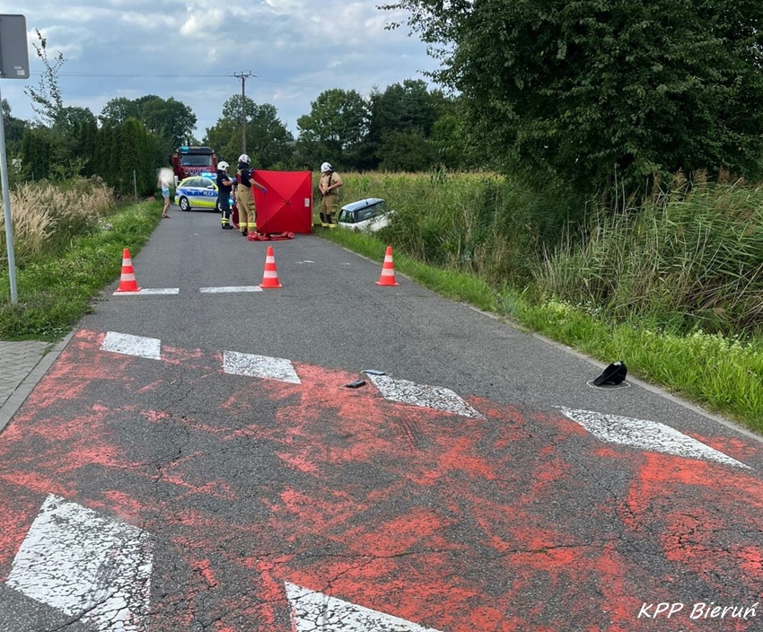 10 sierpnia około godziny 15 na przejeździe rowerowym (znak D-6a) przez ul. Sośnina w Bieruniu doszło do tragicznego w skutkach zdarzenia drogowego. Kierujący samochodem osobowym marki Mini Cooper potrącił znajdującego się na przejeździe rowerowym rowerzystę. Na miejsce zdarzeni zadysponowane zostały: ZRM oraz Policja. Niestety pomimo wysiłku przybyłych na miejsce ratowników medycznych nie udało się uratować życia 70 letniego rowerzysty. Kierujący Mini mężczyzna (42 lata) w chwili zdarzenia był trzeźwy. Dodatkowo po zdarzeniu kierujący osobówką zjechał pojazdem do przydrożnego rowu. Do zabezpieczenia działań Policji na miejsce zadysponowany został zastęp strażaków OSP Bieruń Stary. Policjanci KPP Bieruń pod nadzorem prokuratury prowadzą śledztwo w tej sprawie.