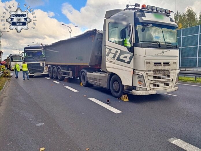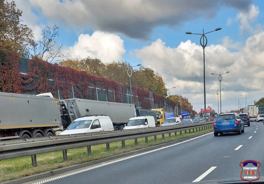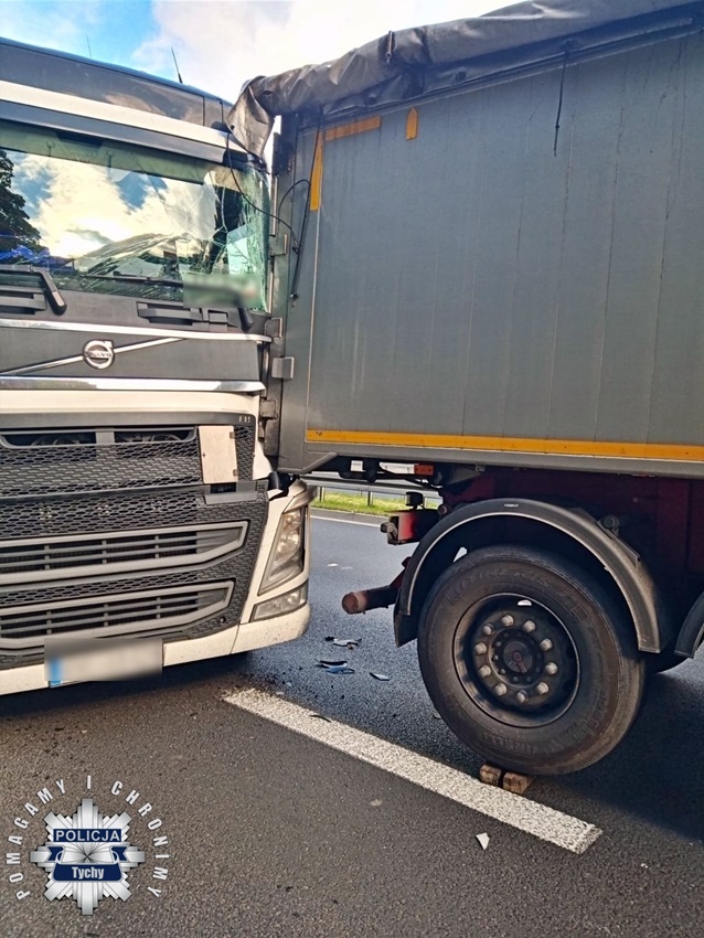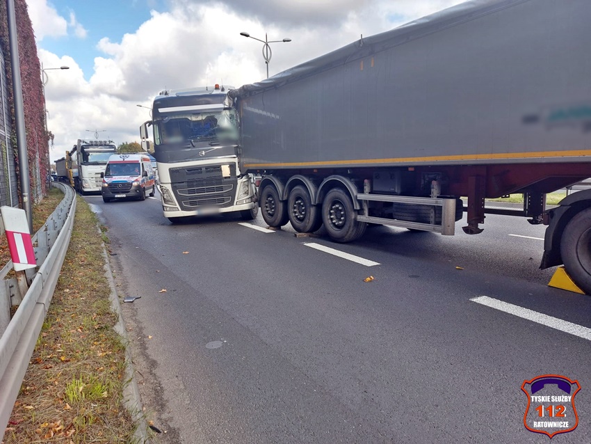 15 października około godziny 12:50 na ul. Beskidzkiej (DK 1 – kierunek Pszczyna) w rejonie skrzyżowania z ul. Edukacji doszło do zdarzenia drogowego z udziałem dwóch ciągników siodłowych marki Volvo z naczepami. W wyniku chwili nieuwagi doszło do najechania na tył poprzedzającej naczepy przez kierującego jednym z ciągników. Na miejsce zdarzenia zadysponowane zostały: ZRM, zastępy strażaków JRG Tychy oraz Policja. Przez kilkanaście minut droga była zablokowana całkowicie, a po wstępnych czynnościach udrożniony został lewy pas. Kierowca feralnego pojazdu trafił pod opiekę ratowników medycznych. Na szczęście nie doznał on poważnych obrażeń. Uszkodzony ciągnik siodłowy został odholowany przez pomoc drogową. Za spowodowanie zdarzenia drogowego kierowca został ukarany mandatem karnym. Utrudnienia w ruchu w miejscu zdarzenia trwały około trzech godzin.