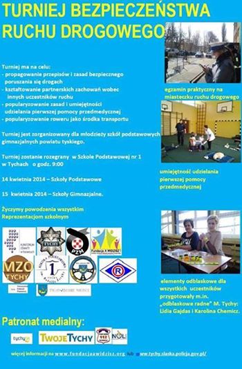 W dniach 14 – 15 kwietnia w Szkole Podstawowej nr 1 w Tychach odbył się Turniej Bezpieczeństwa Ruchu Drogowego. W ciągu dwóch dni w szranki stanęły cztero osobowe drużyny tyskich szkól podstawowych i trzy osobowe gimnazjów. W pierwszym dniu startowały szkoły podstawowe, a w drugim gimnazja. Turniej oceniany jest przez funkcjonariuszy tyskiej Policji , Straży Miejskiej, a także przedstawiciela AZT. W turnieju wystartowało 14 tyskich szkół podstawowych: