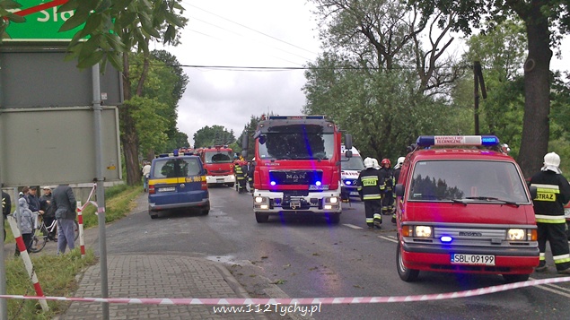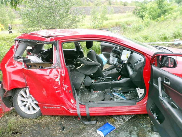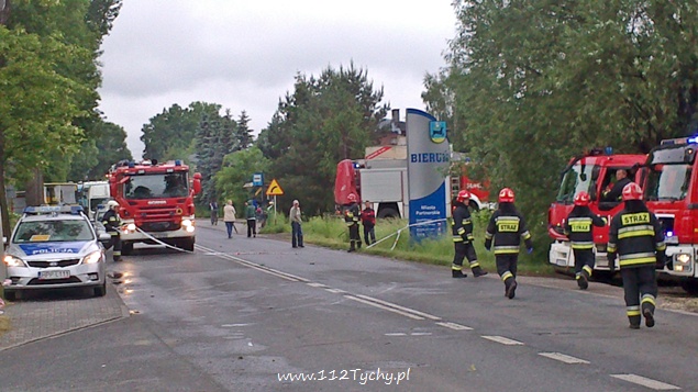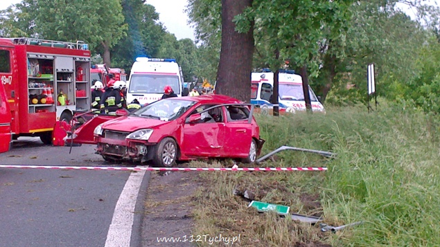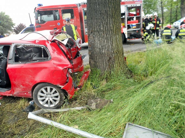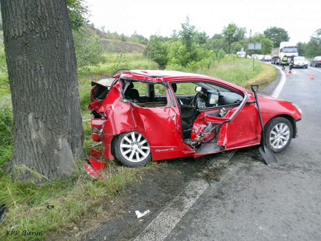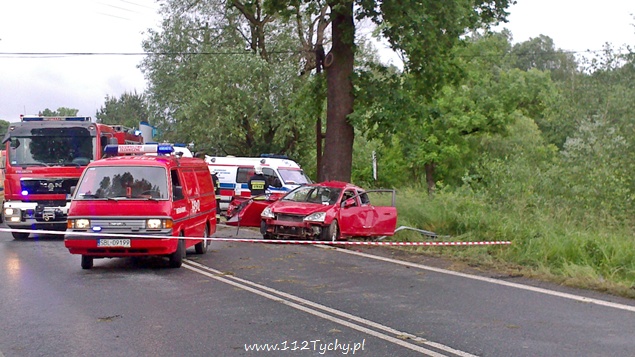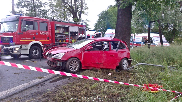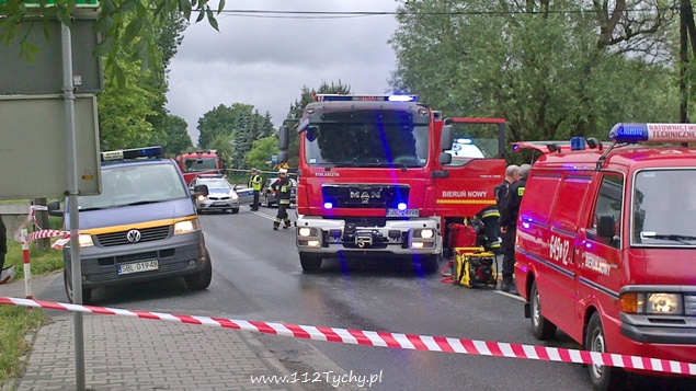 29 maja około godziny 14.30 na ul. Wawelskiej w Bieruniu doszło do wypadku drogowego. Kierujący Hondą Civic mężczyzna podczas manewru wyprzedzania w trudnych warunkach atmosferycznych utracił panowanie nad swoim pojazdem i uderzył w przydrożne drzewo. O wypadku powiadomione zostały służby ratownicze. Na miejsce wysłane zostały trzy zastępy strażaków z JRG Tychy, dwa zastępy z OSP Bieruń Nowy, cztery karetki pogotowia oraz patrol bieruńskiej Policji.Po dotarciu na miejsce okazało się, że poszkodowane jest łącznie pięć osób podróżujących samochodem osobowym. Trzy z nich były już poza pojazdem. Dwie osoby strażacy musieli ewakuować z rozbitego pojazdu przy użyciu specjalistycznego sprzętu. Ze względu na obrażenia osób poszkodowanych do pomocy wezwany został również śmigłowiec LPR. Wszystkie osoby poszkodowane zostały przetransportowane do szpitala. Ruch w obu kierunkach został całkowicie wstrzymany. Działania strażaków polegały dodatkowo na zabezpieczeniu miejsca zdarzenia, zabezpieczeniu lądowiska dla śmigłowca LPR, odłączeniu akumulatora w rozbitym samochodzie oraz usunięciu jego szczątków i płynów eksploatacyjnych z jezdni. Dokładne przyczyny i okoliczności tego zdarzenia wyjaśniają bieruńscy Policjanci. W zabezpieczeniu miejsca zdarzenia pomagał patrol bieruńskiej Straży Miejskiej. Po około dwóch godzinach działania zostały zakończone i ruch został przywrócony.