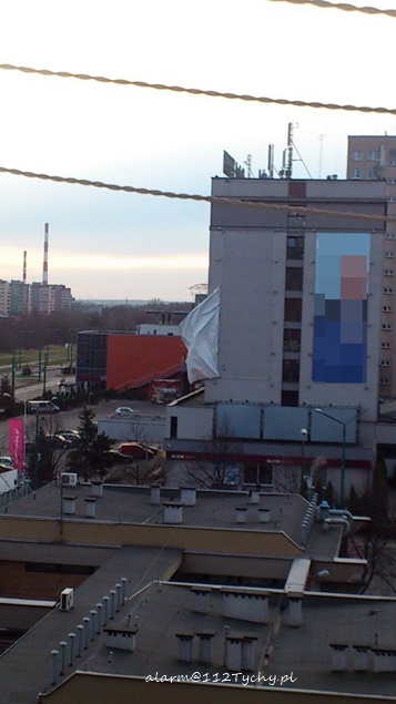 13 grudnia około godziny 8 rano do MSK w Tychach wpłynęło zgłoszenie o zerwanej reklamie wielkopowierzchniowej na zewnętrznej ścianie budynku Hotelu Tychy od ul. Dmowskiego. Na miejsce wysłany został jeden zastęp z JRG Tychy (GBA). Po dotarciu na miejsce i rozpoznaniu sytuacji KDR podjął decyzje o konieczności wezwania na miejsce drabiny mechanicznej (SD). Po dotarciu na miejsce zastępu i sprawieniu drabiny strażacy z kosza ratowniczego zdjęli reklamę i przekazali pracownikom hotelu. Przez około 30 minut prawy pas ruchu ul. Dmowskiego (na wysokości hotelu) do ronda z Jana Pawła II był wyłączony z ruchu. Była to jedna z wielu interwencji w ostatnich dniach związanych z silnym wiatrem.