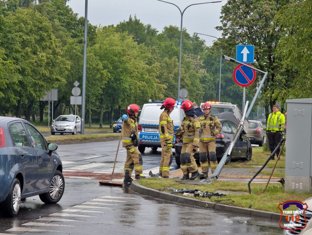 W wyniku zderzenia Seat skosił znaki drogowe oraz słup sygnalizacji świetlnej.