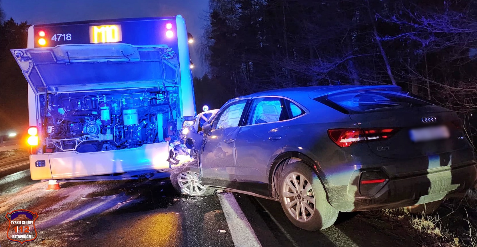Kierujący samochodem osobowym marki Audi z dużą siłą uderzył w tył autobusu marki MAN.
