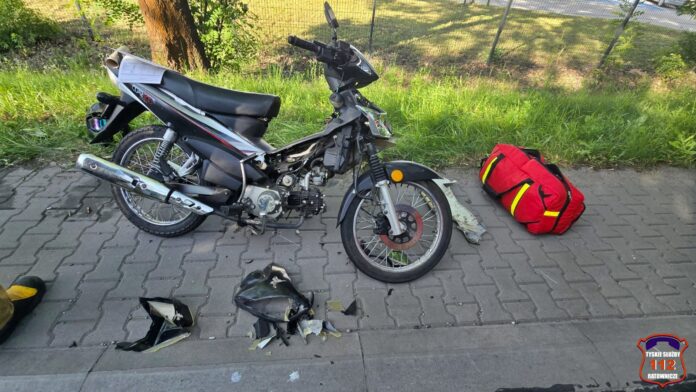 Kierowca osobowej Skody wyszedł ze zdarzenia bez szwanku, a kierujący jednośladem trafił pod opiekę ratowników medycznych.